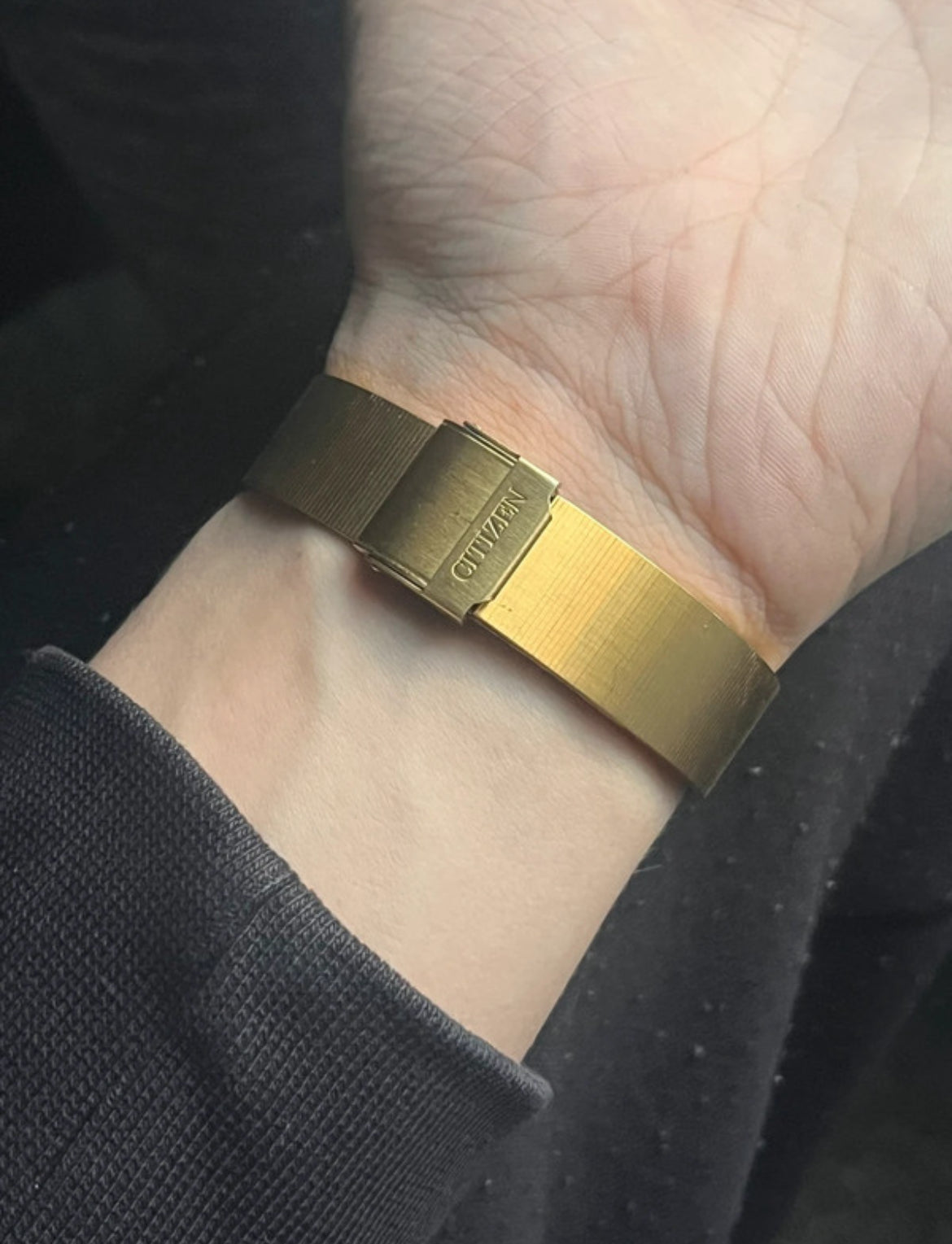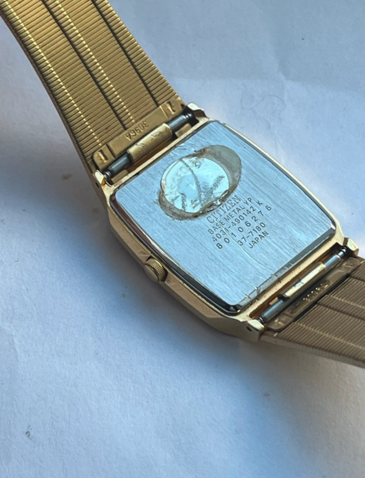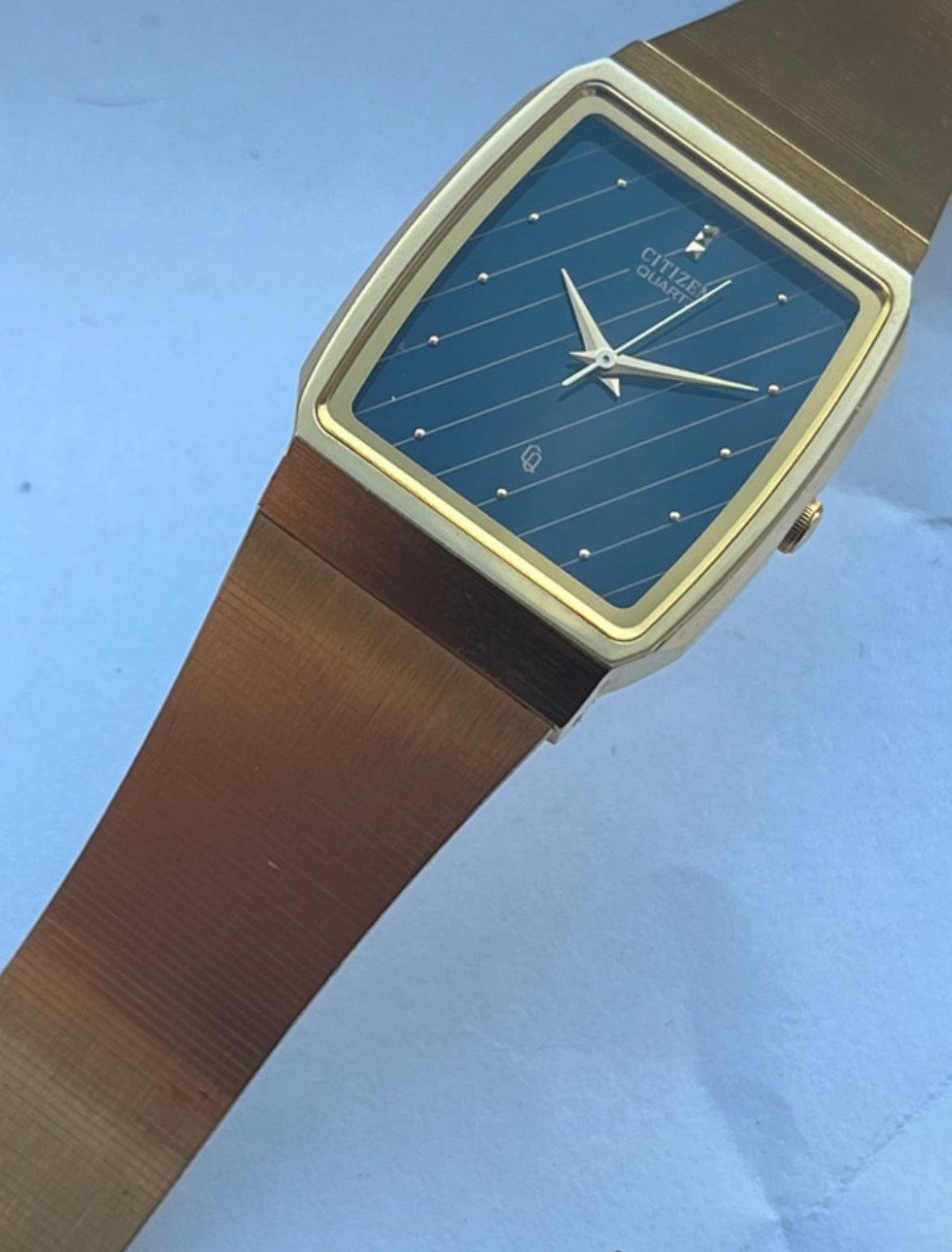 This is a vintage mens tank watch from citizen with a stunning gold plated case and black dial . It’s in great vintage condition. The case is gold plated. Fitted on its original full length rotary mesh strap, easily adjustable by the clasp