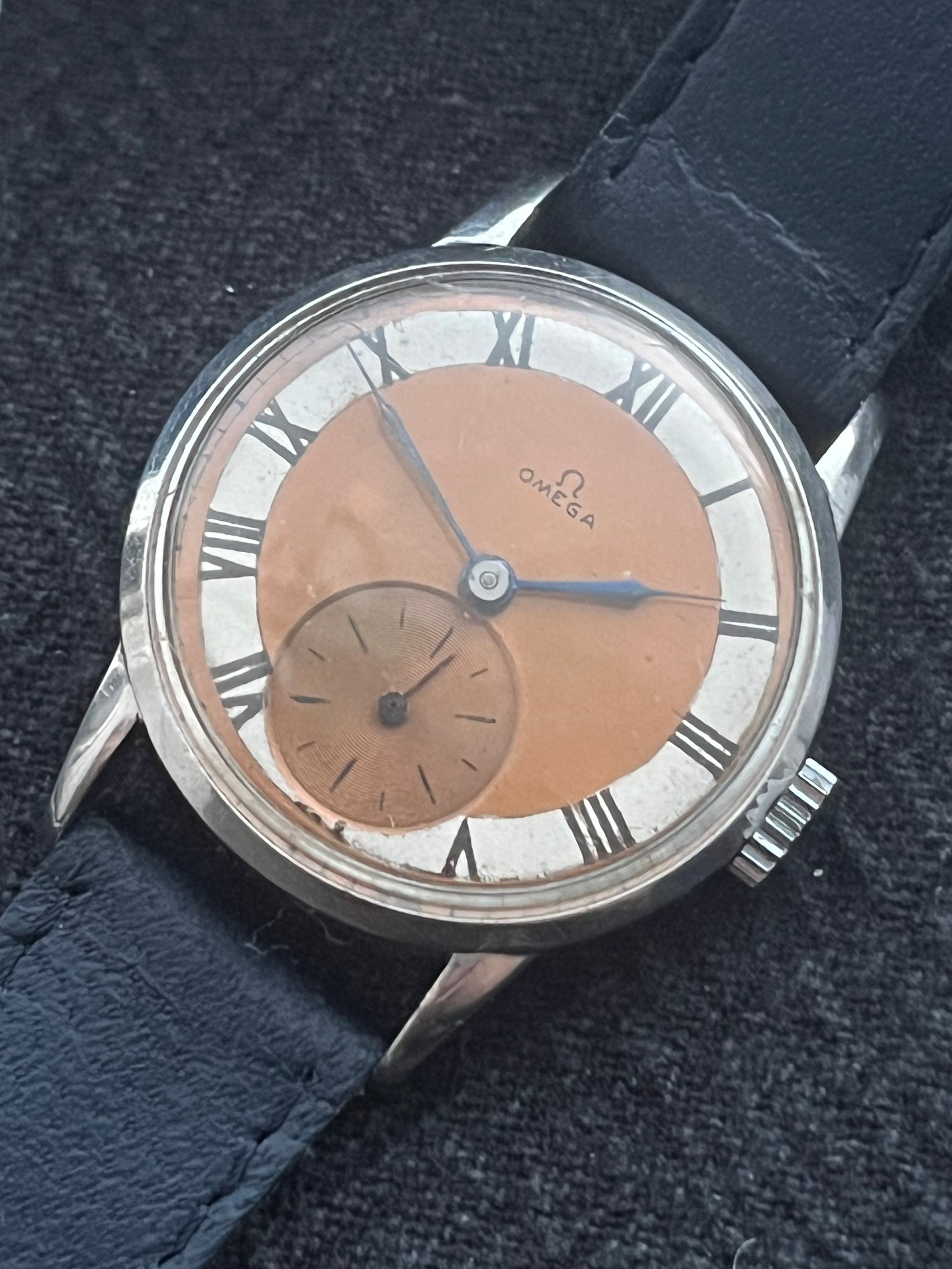 This is an incredible mens Omega sub seconds from the 1940’s which features a cream and cooper dial and perfect blued steel hands and sub-seconds dial in great vintage condition. Showing light scratches and general use as expected. On a 16mm leather strap.