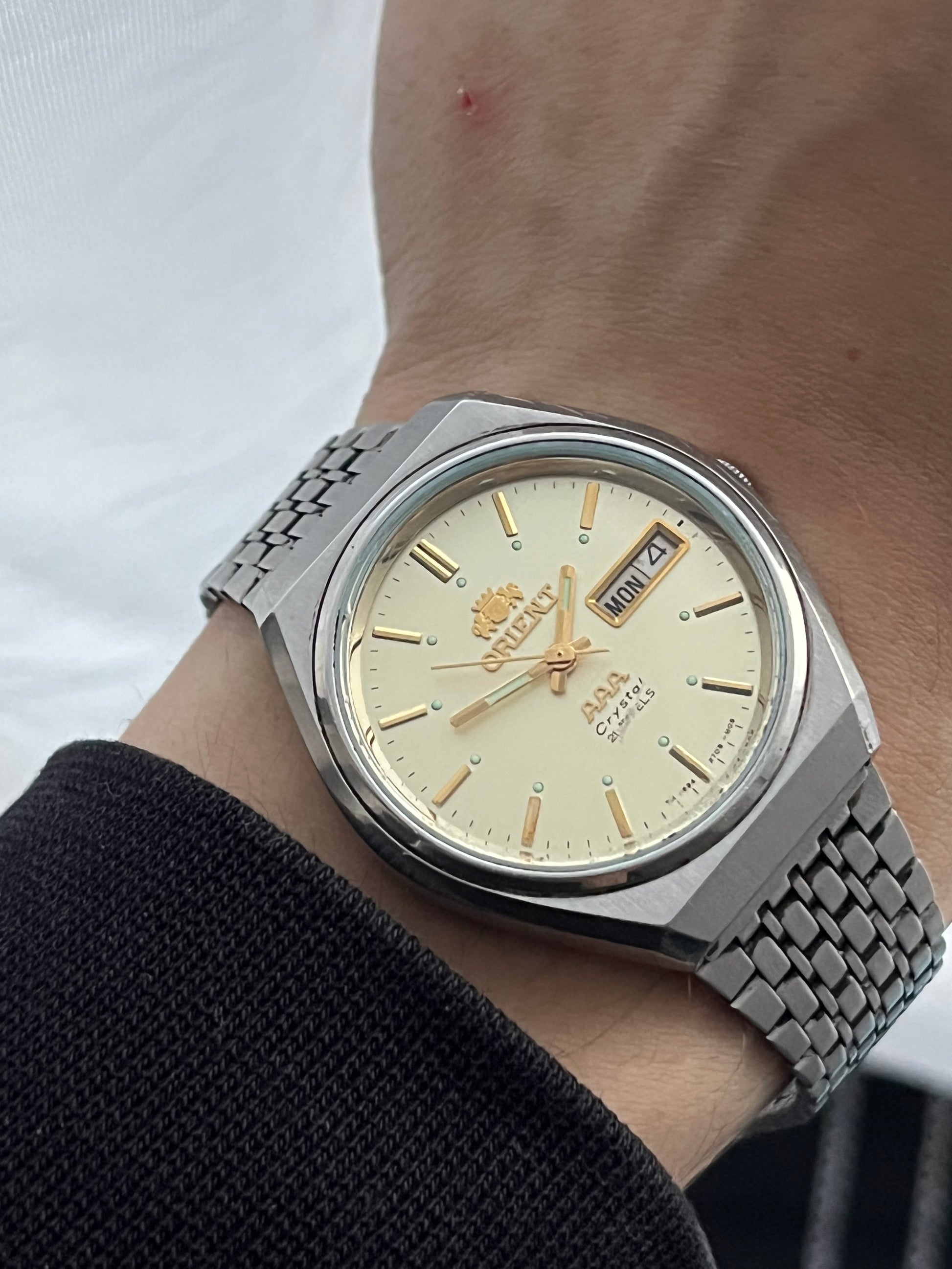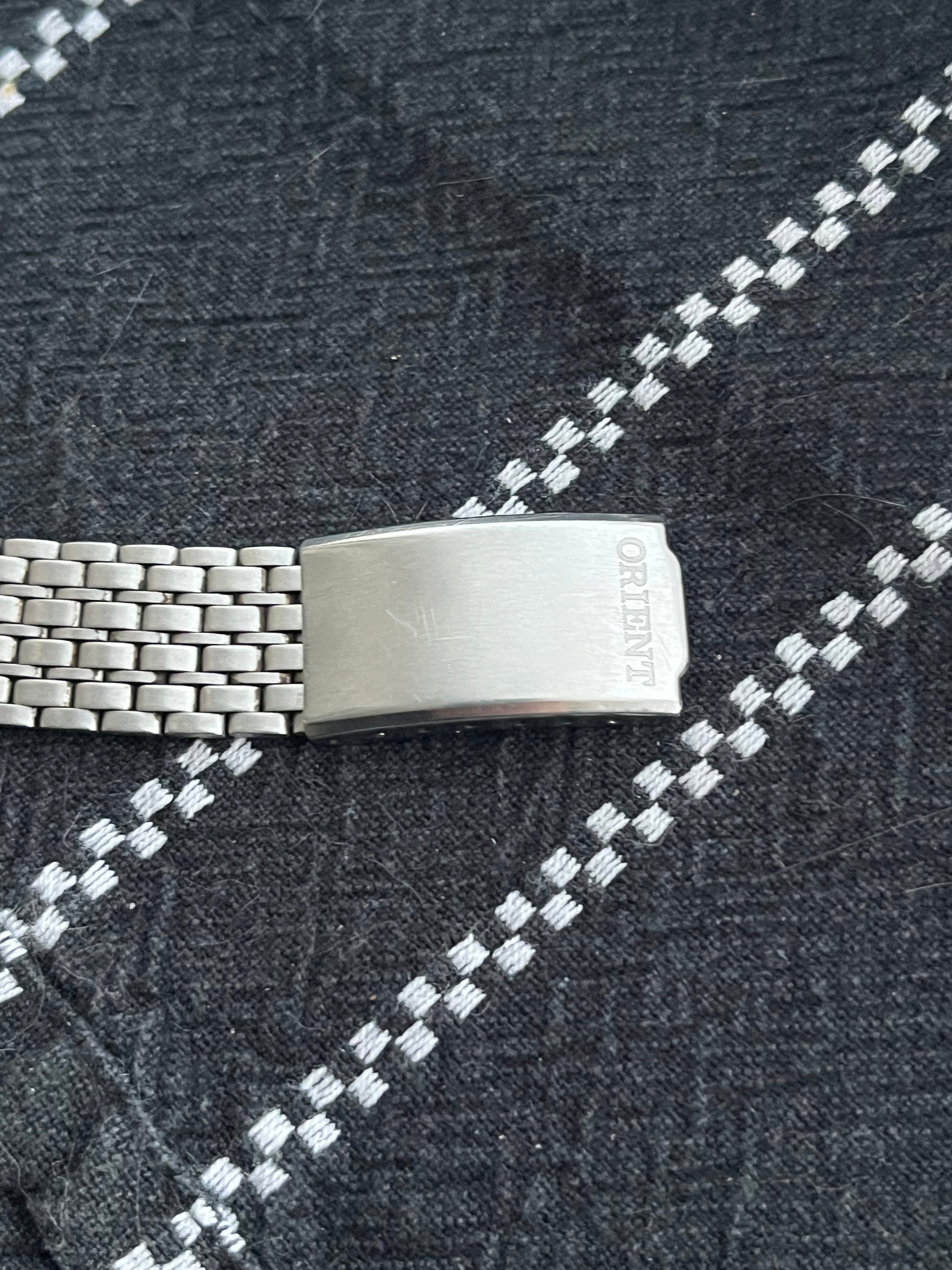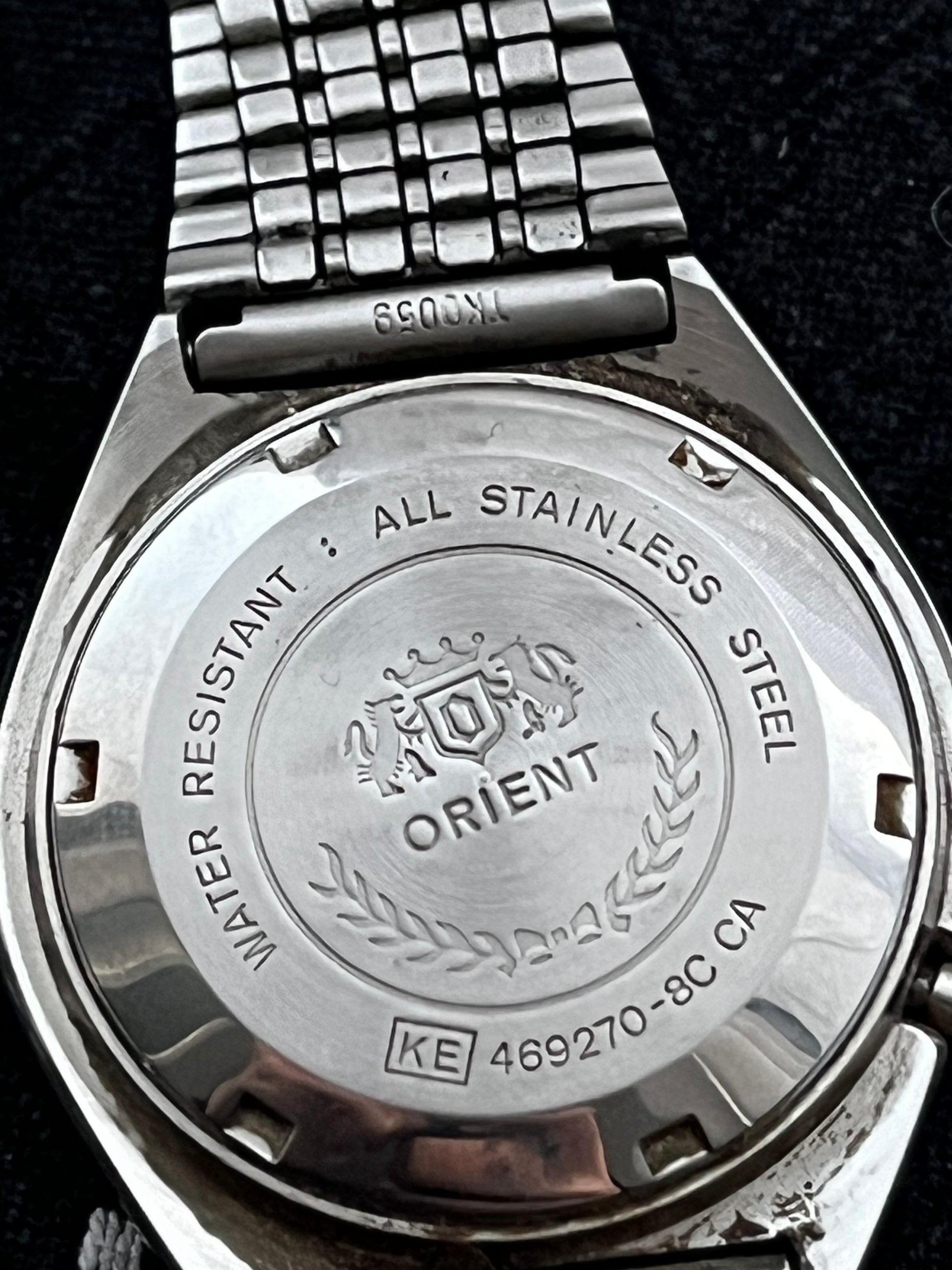 Vintage Orient day date. In very good condition for age. On its original strap which has all the links. 37mm wide. Keeping time. Mark above ‘6