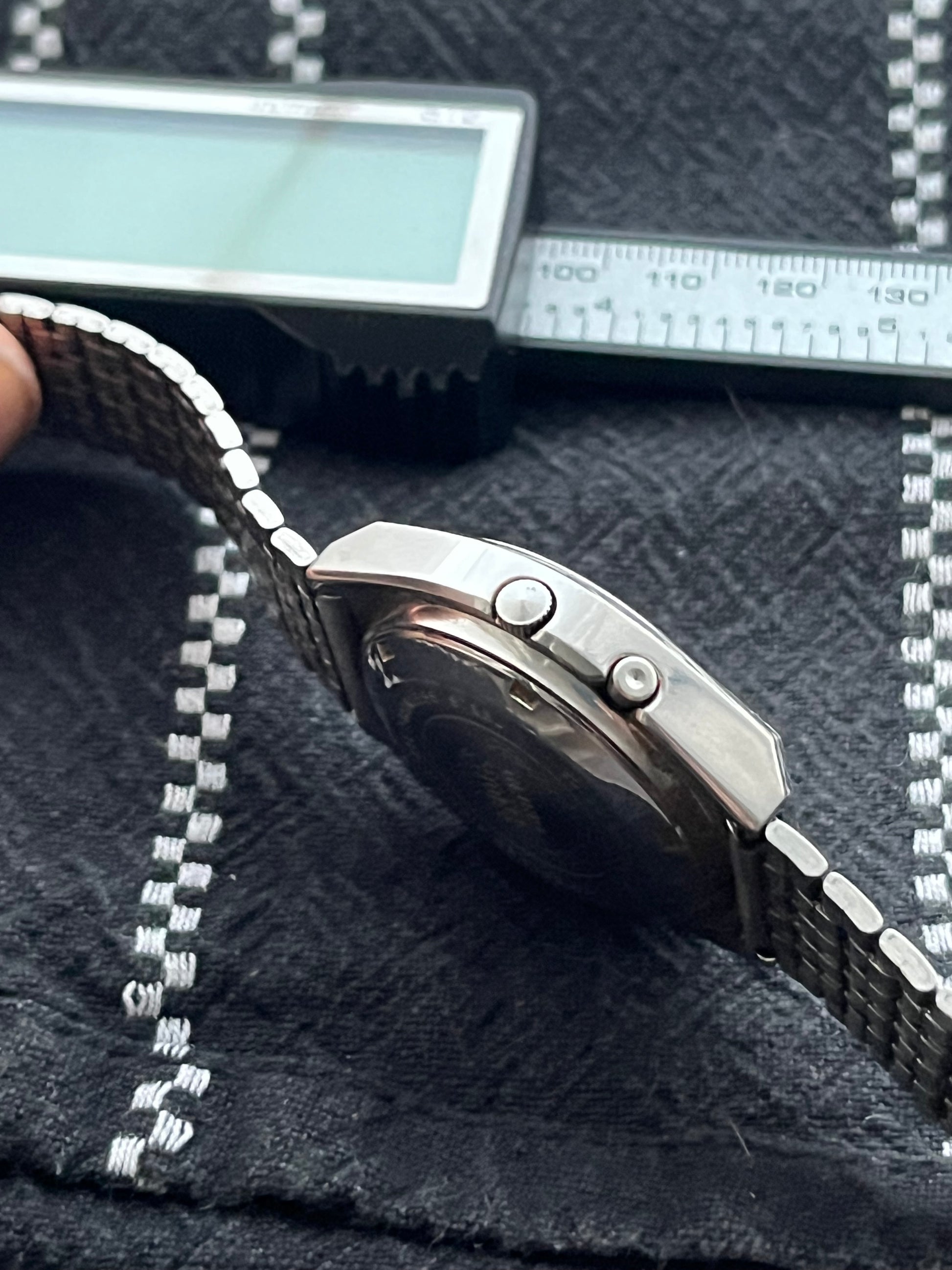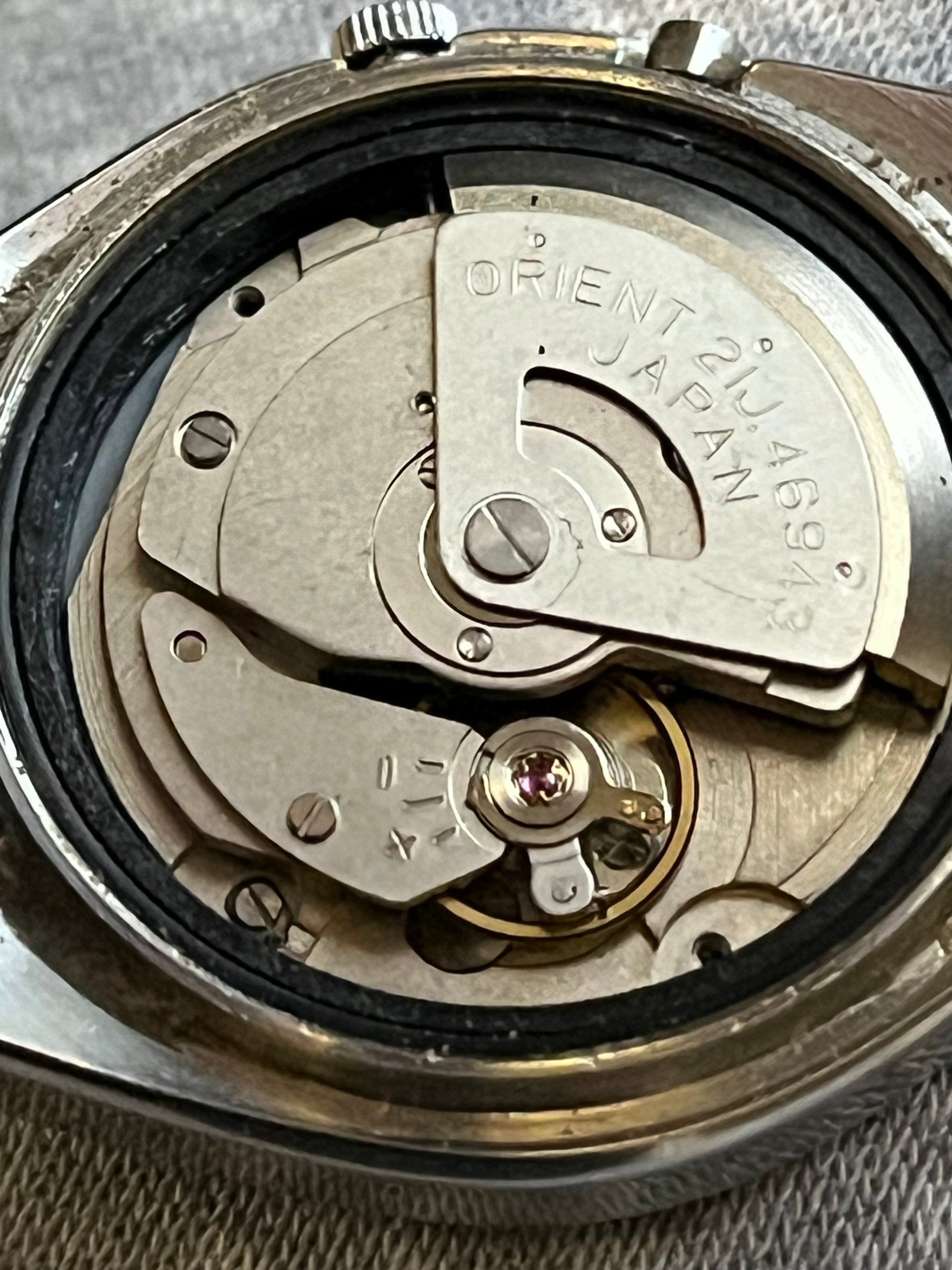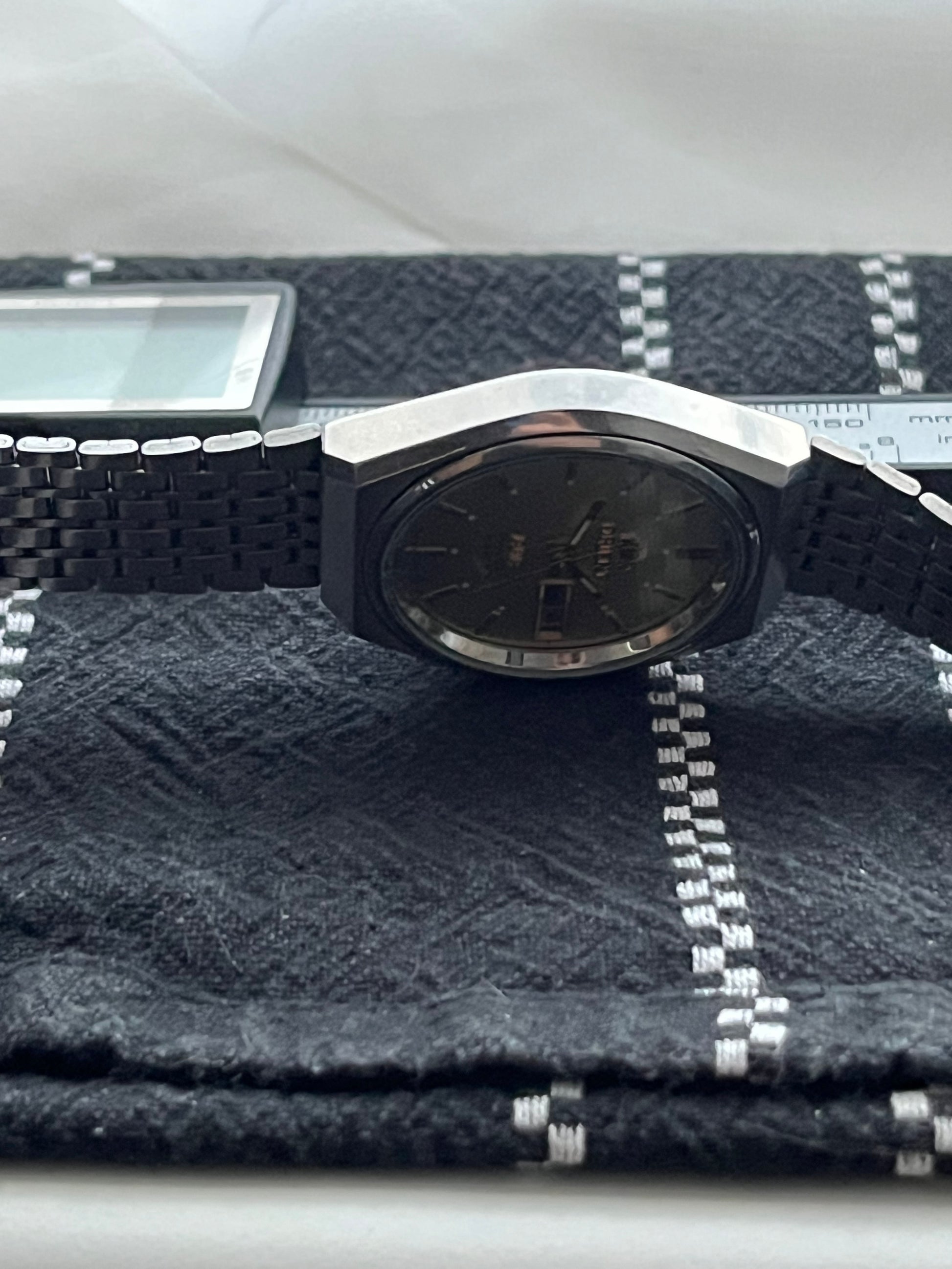 Vintage Orient day date. In very good condition for age. On its original strap which has all the links. 37mm wide. Keeping time. Mark above ‘6