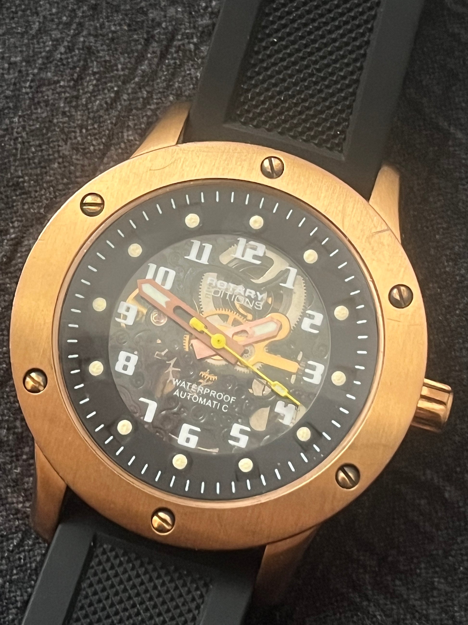 This is a sophisticated mens rotary editions automatic with the skeleton dial . It’s in great condition. Automatic Easy reader dial, Waterproof watch & strap.