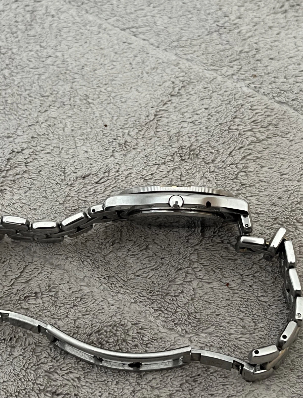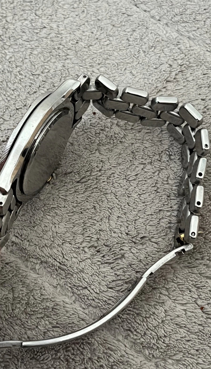 This is a stunning mens rotary moonphase with a Day, Date, Month Feature. Sleek two-tone look . It’s in great vintage condition. full stainless steel. Shows light fading due to age.