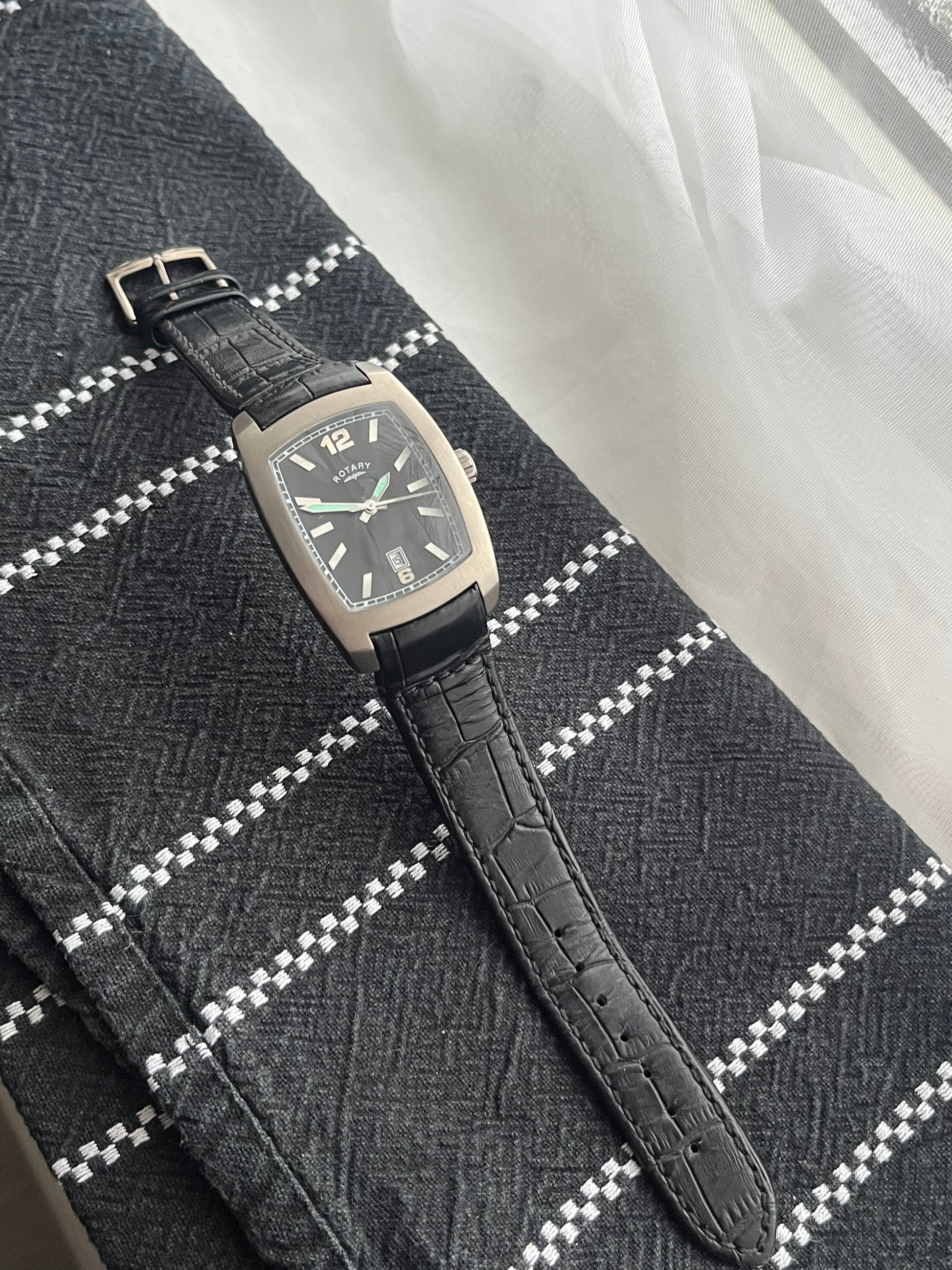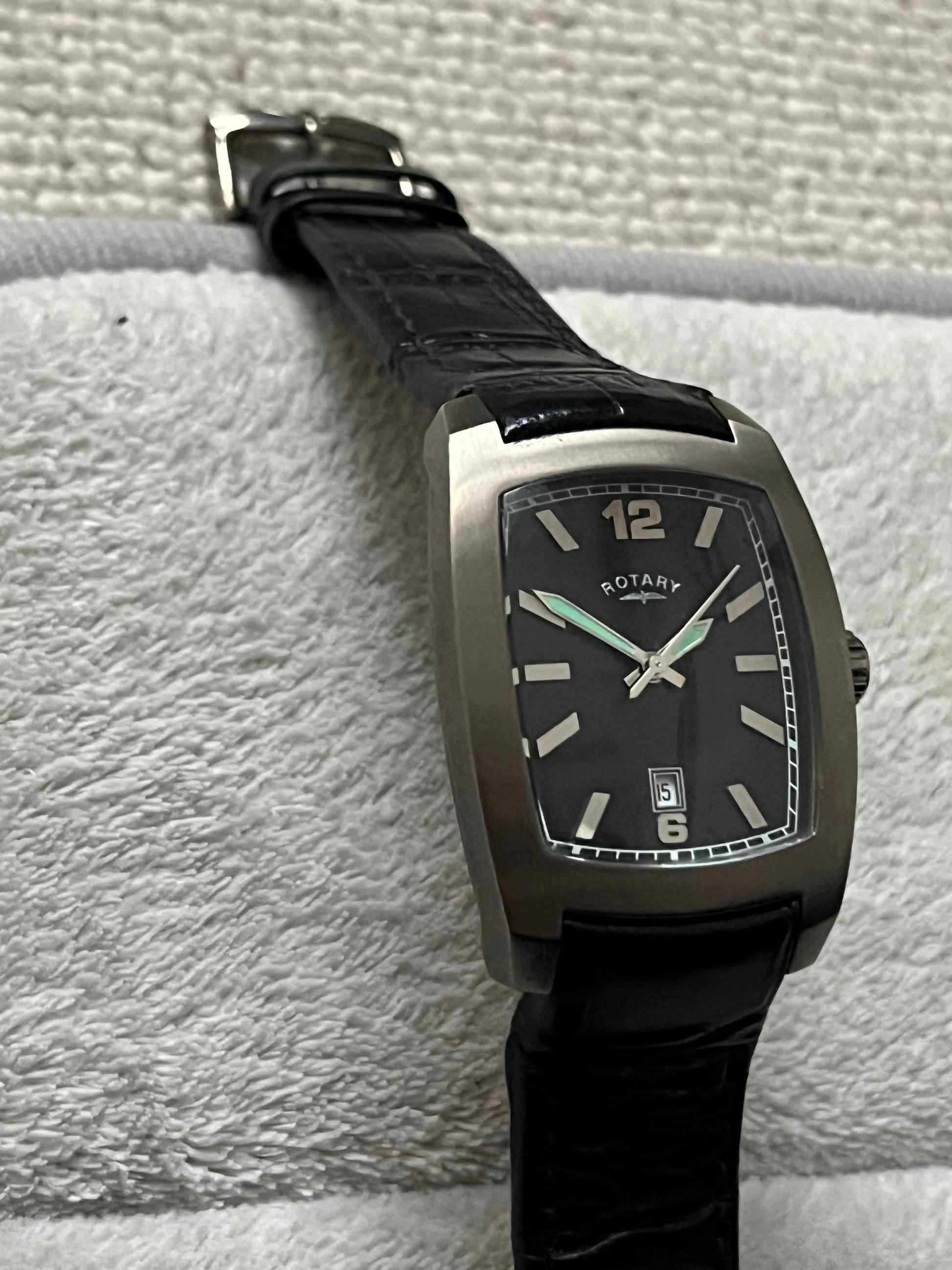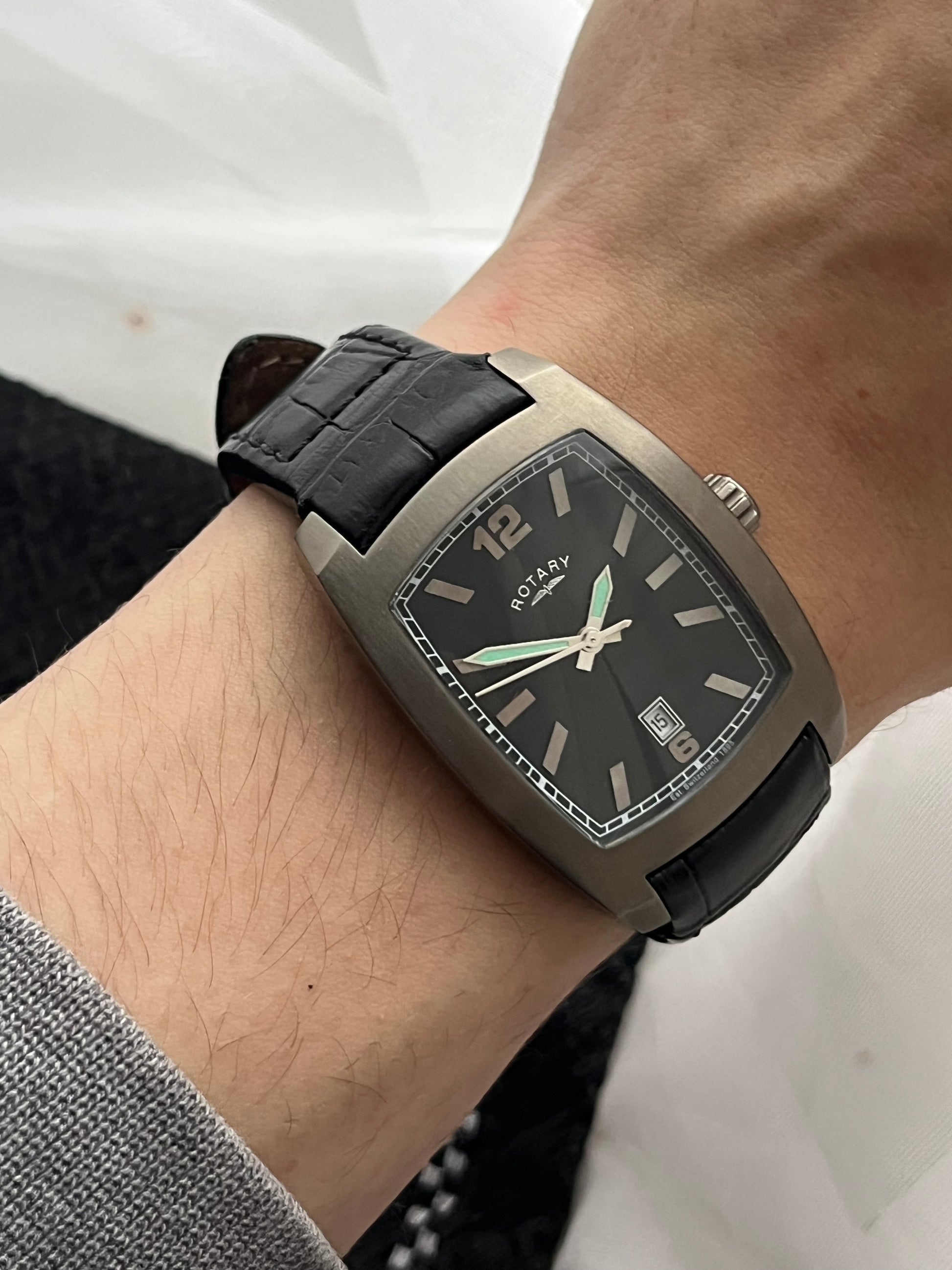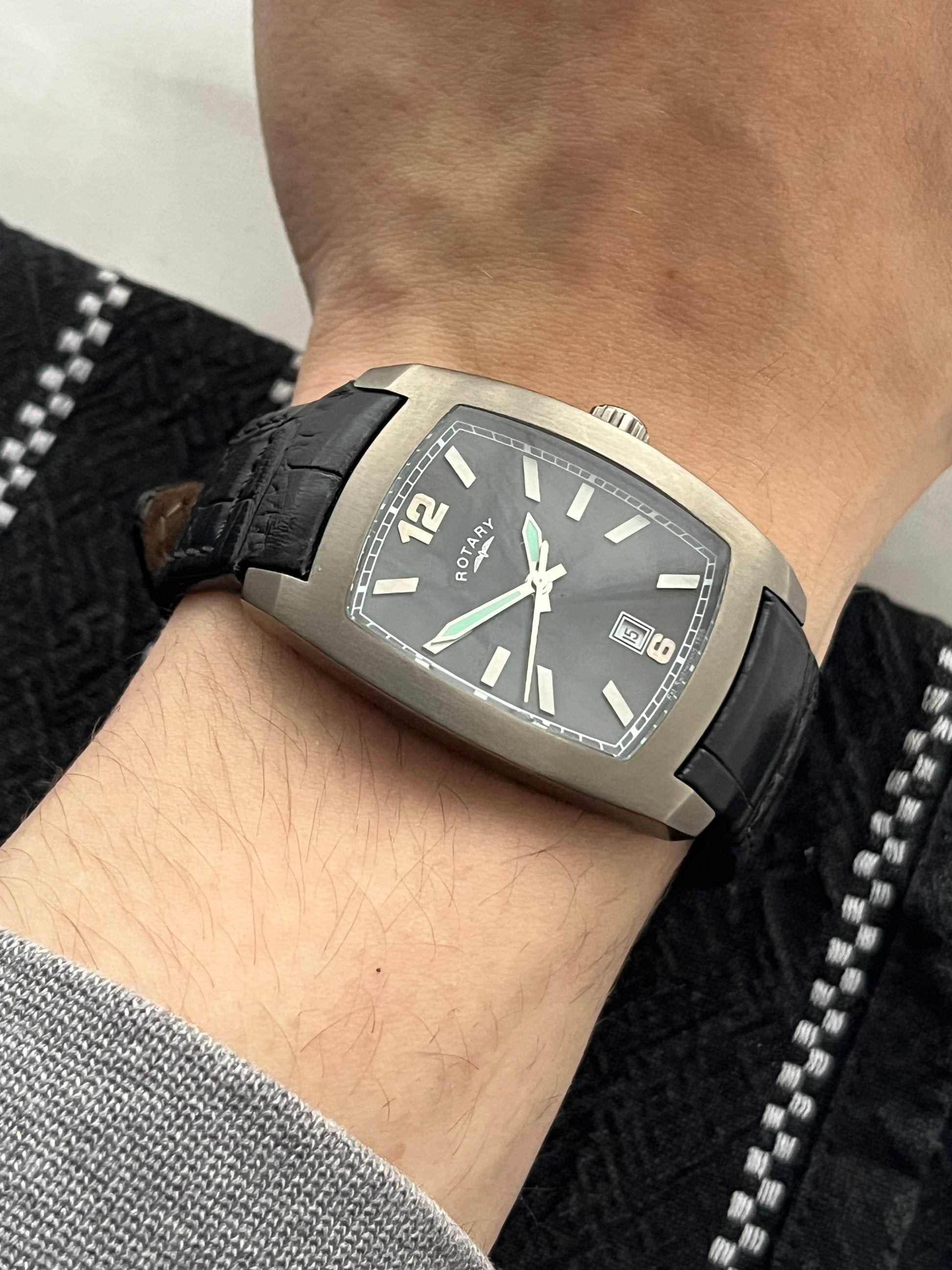 This is a mens rotary diver style watch with a Date window, screw down crown, Tank style case. Clean two-tone look . It’s in great vintage condition. full stainless steel case & original leather strap & buckle. The hands are illuminous. Shows light scratches due to age.