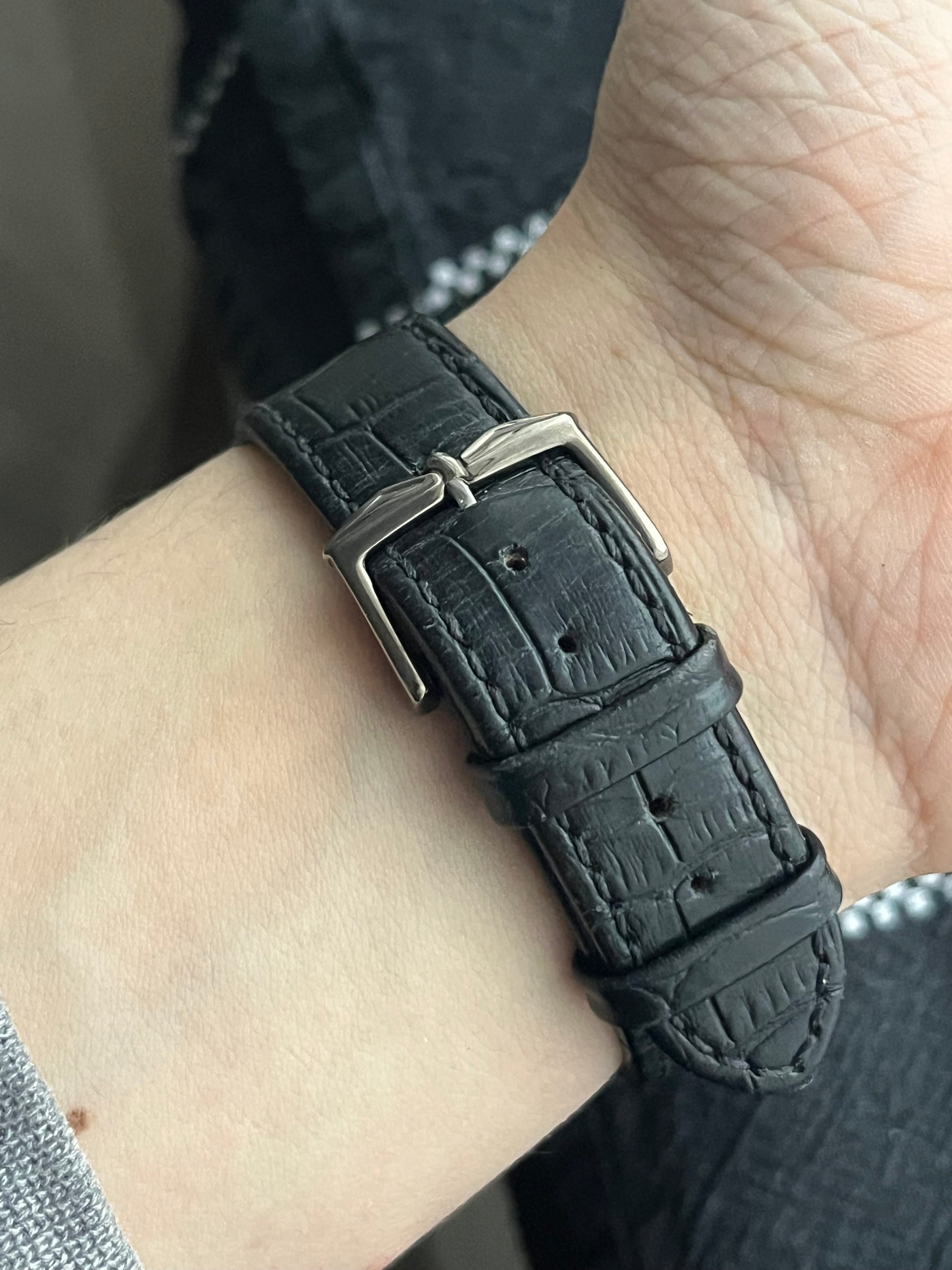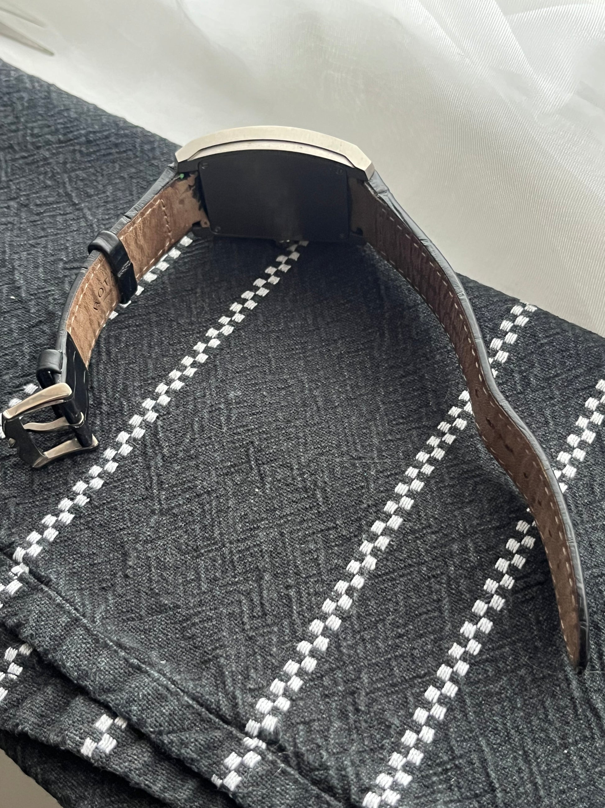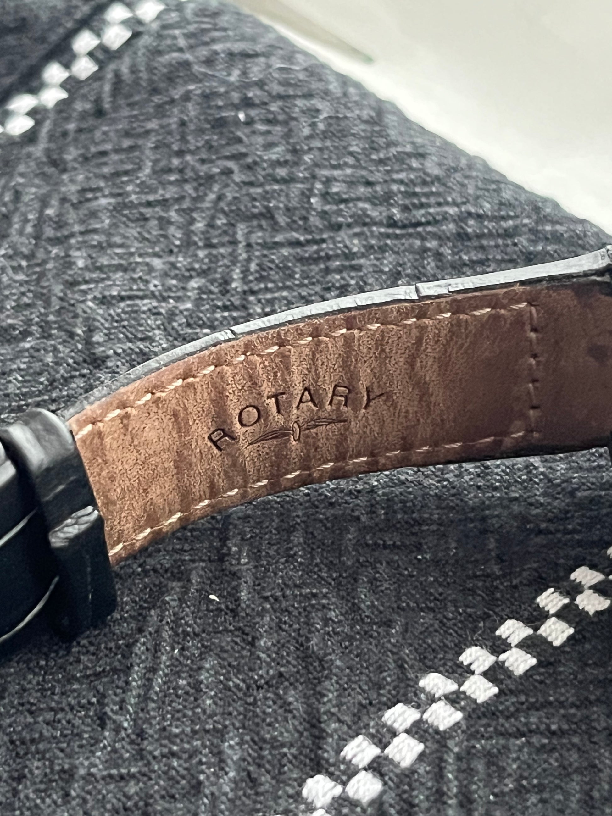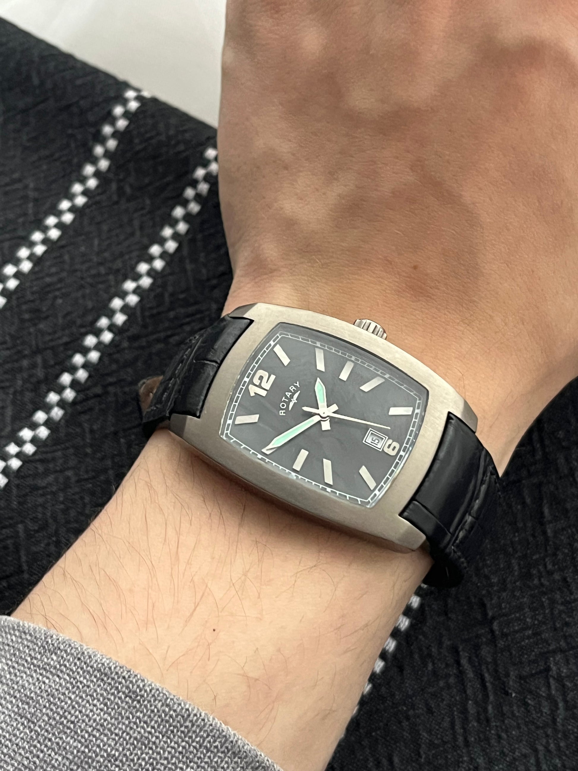 This is a mens rotary diver style watch with a Date window, screw down crown, Tank style case. Clean two-tone look . It’s in great vintage condition. full stainless steel case & original leather strap & buckle. The hands are illuminous. Shows light scratches due to age.