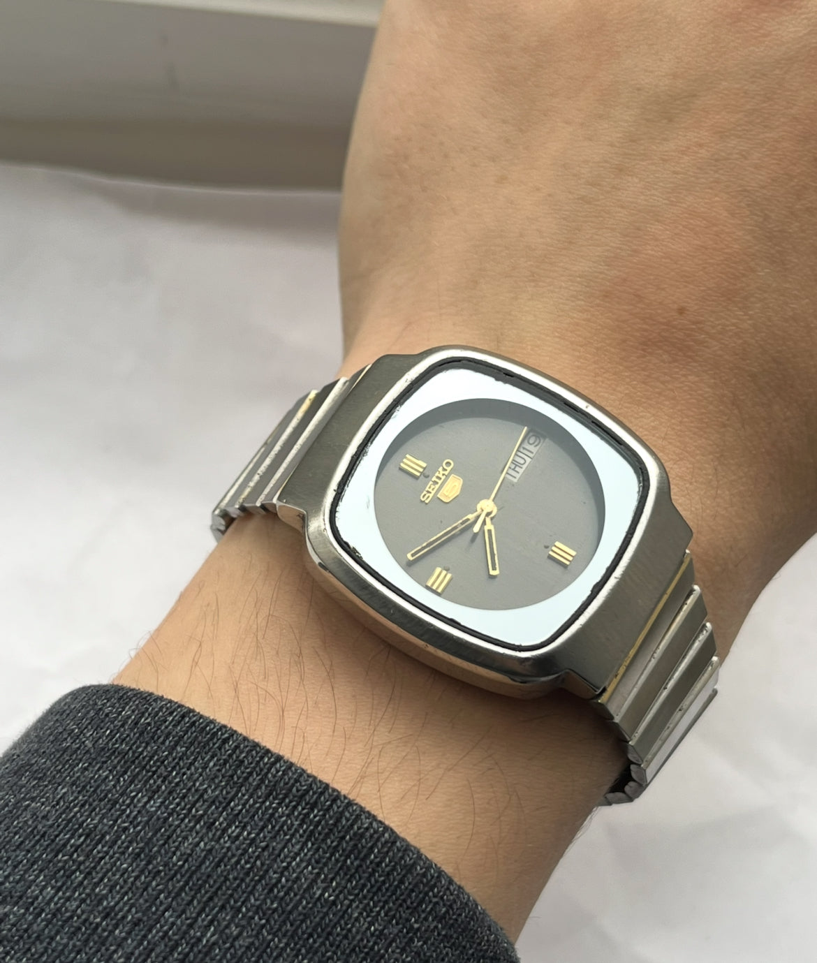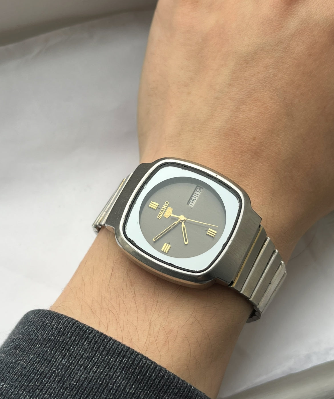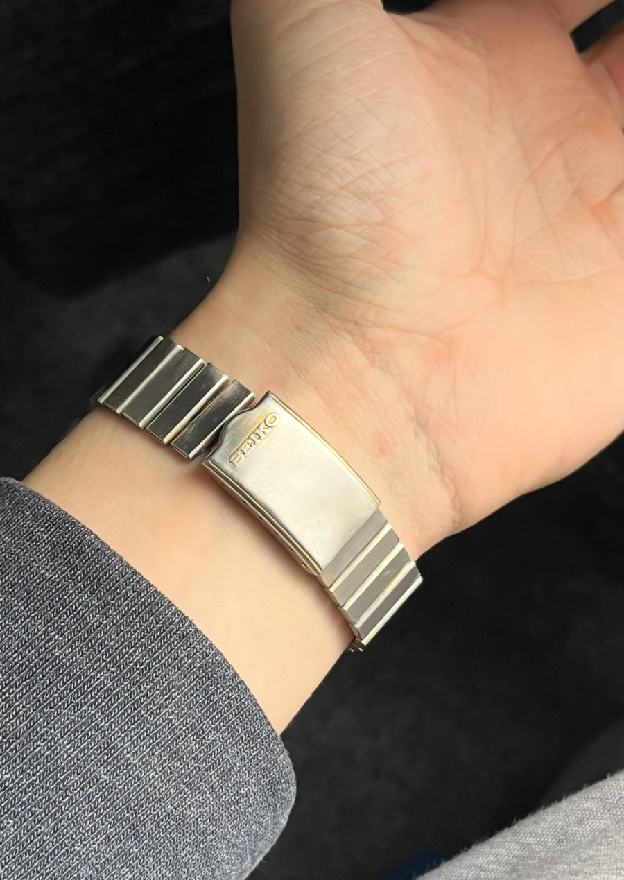 This is a stunning mens seiko automatic with a Day, Date, Sleek two-tone look . TV case, It’s in good vintage condition. full stainless steel. Shows light markings due to age.