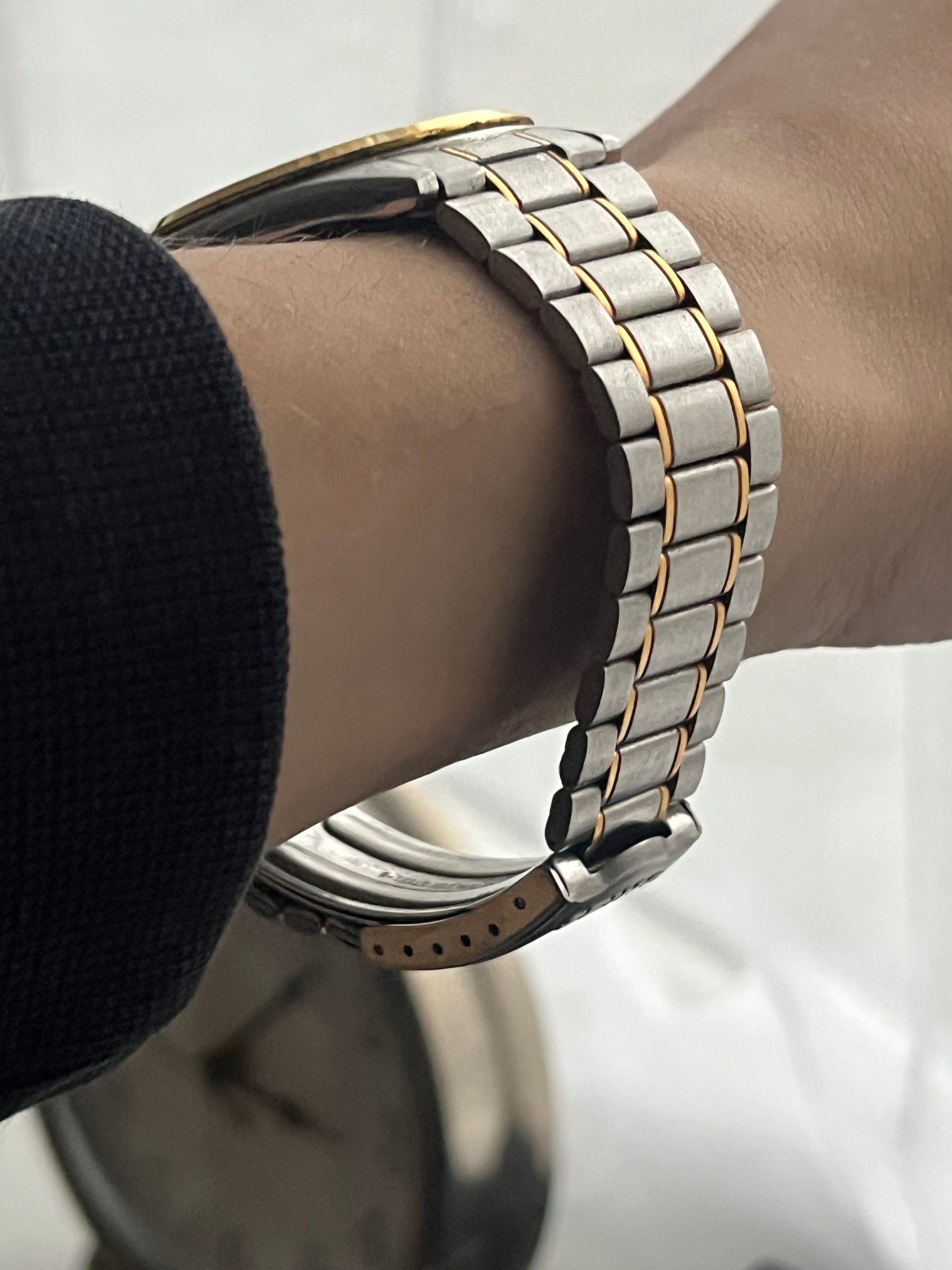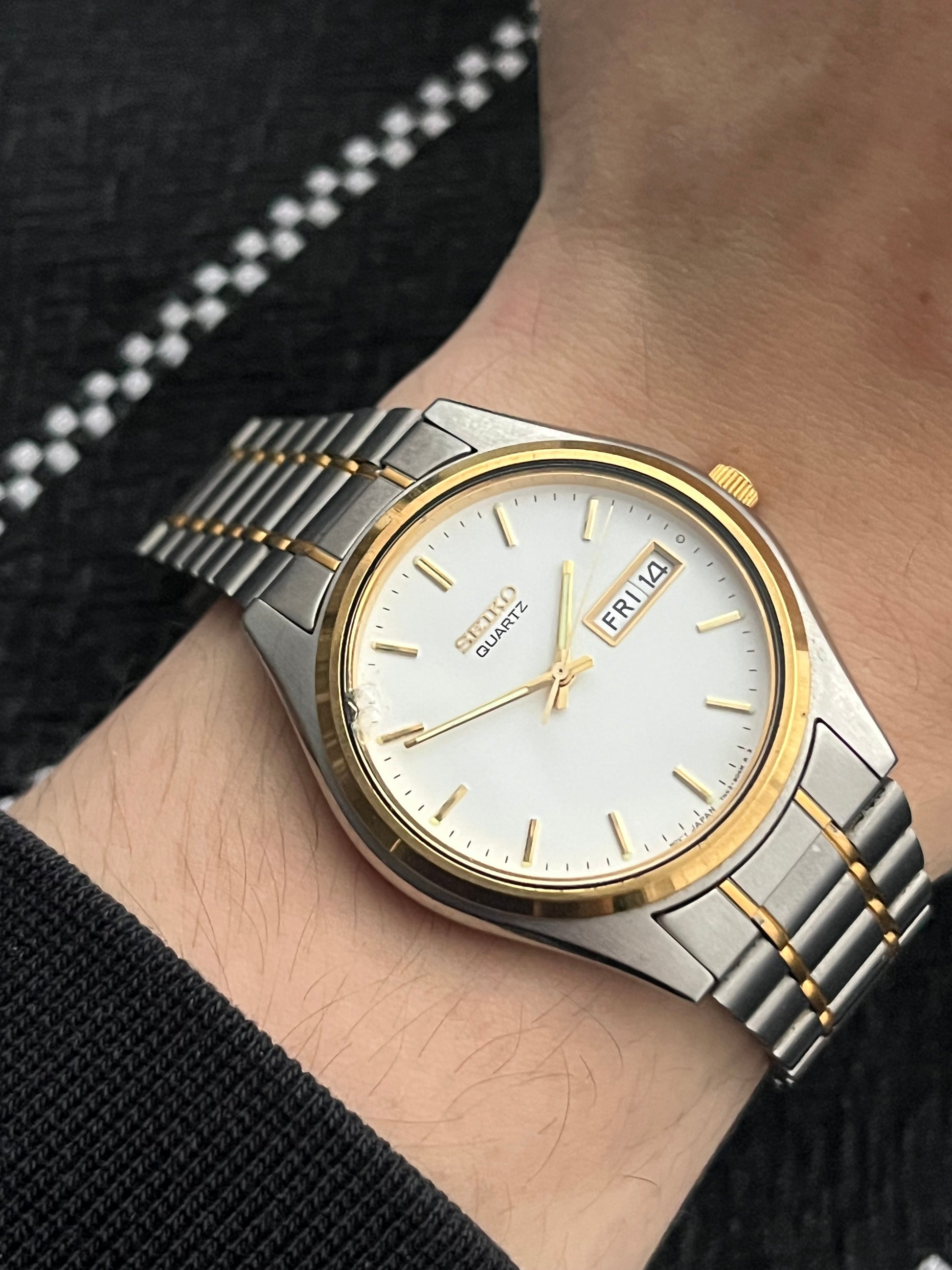 This is a vintage seiko day date model with the white dial. gold and silver case. Produced from 1995-2005. It’s in great vintage condition. There’s a mark at 10’ on the glass .