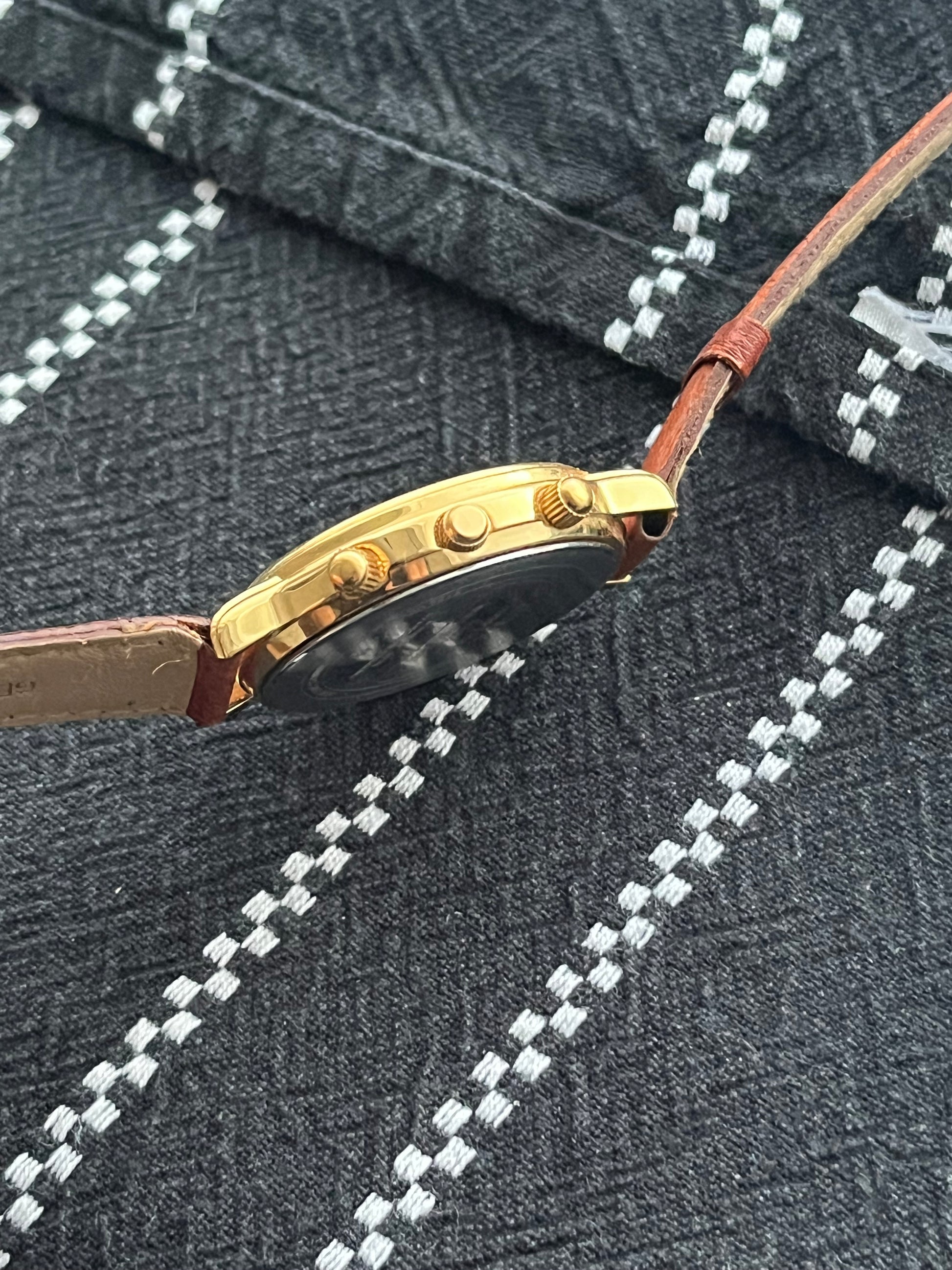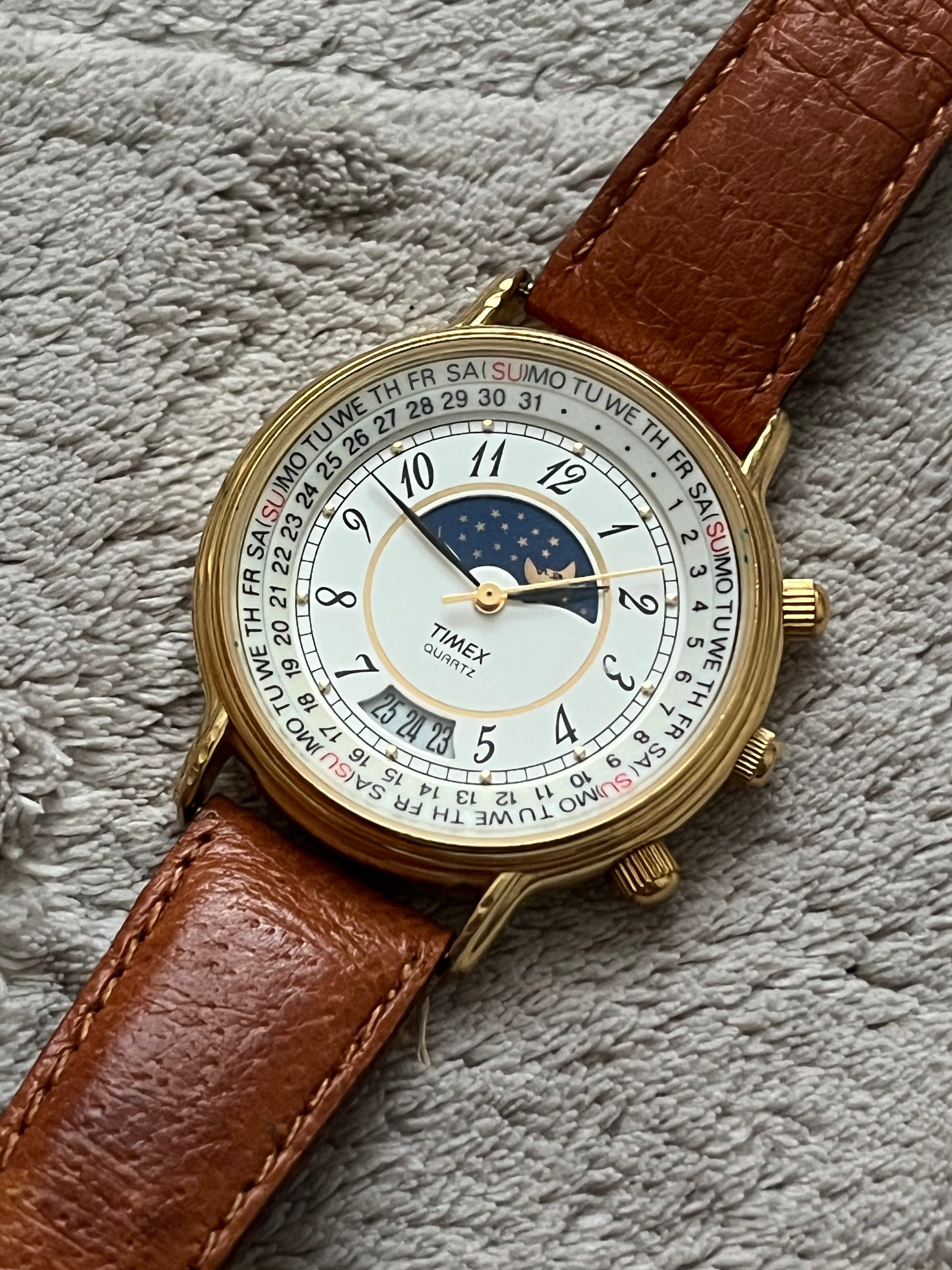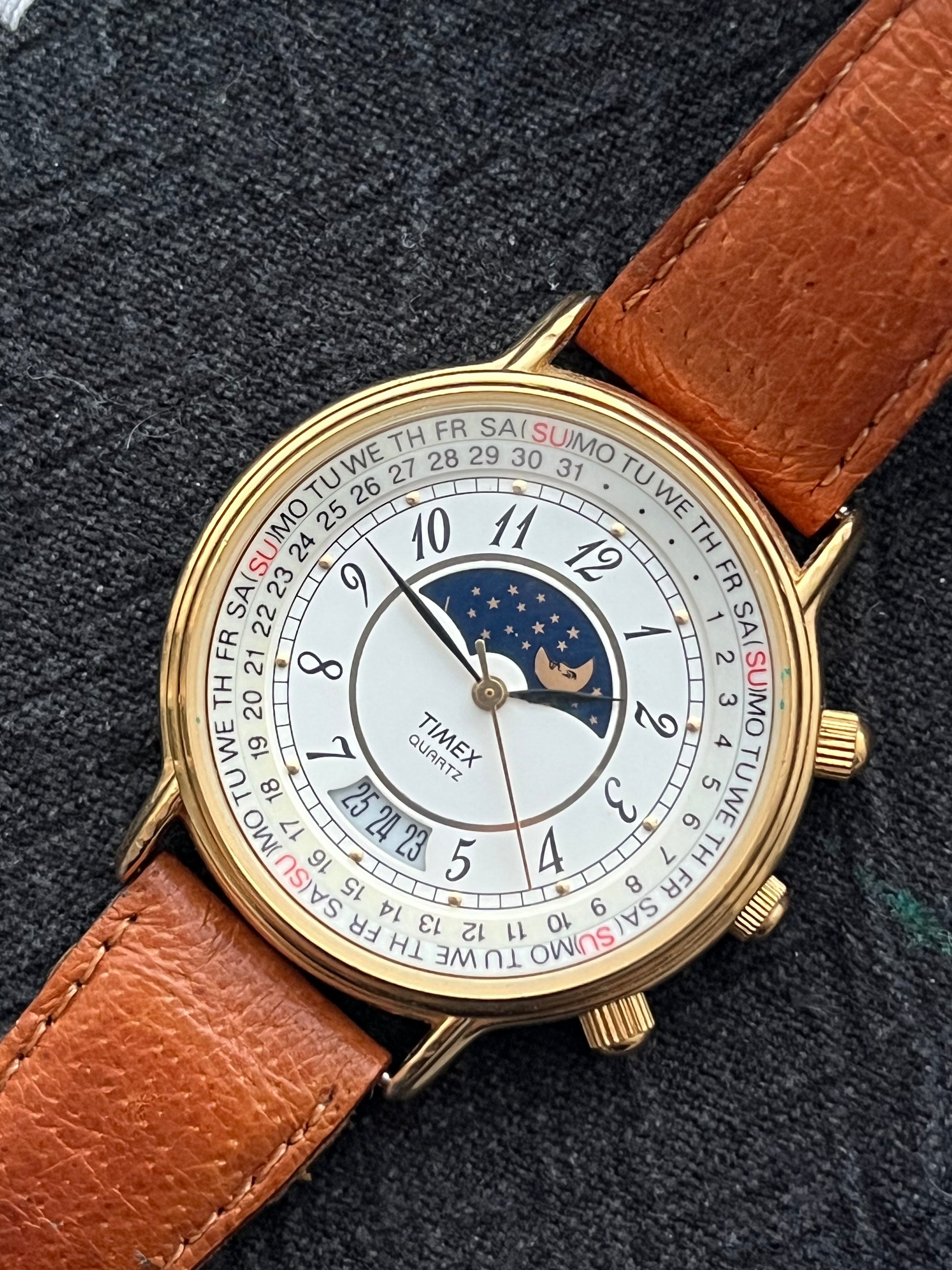 for sale is a stunning gold plated Timex MoonPhase Mens Watch, Made in the 1990’s. Features a stunning gold look with the white easy reader dial. On a leather strap.
