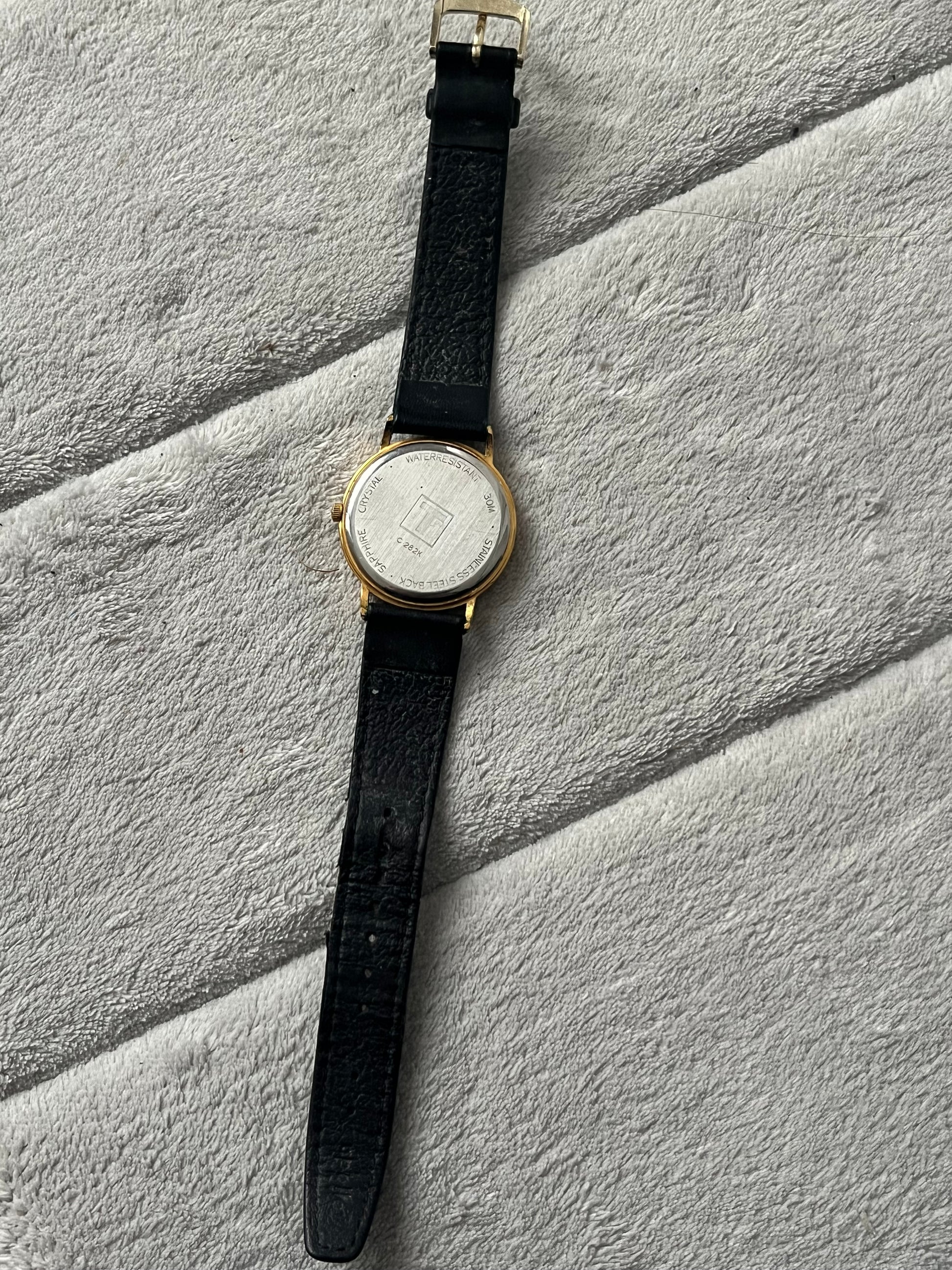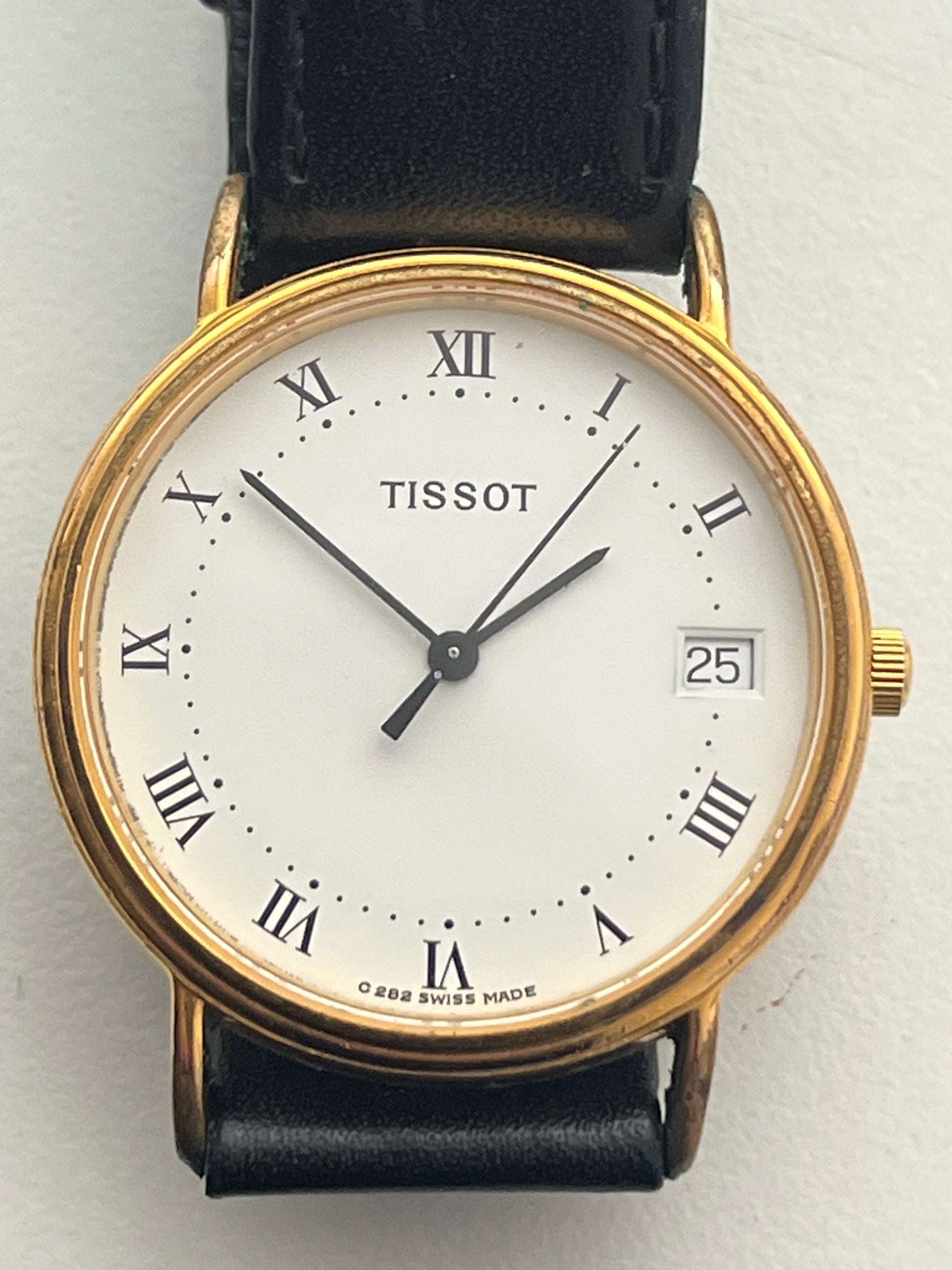 This is a Vintage Tissot Men’s dress Watch with date, gold plated case & stunning white Roman numeral dial with black hands. Excellent vintage Condition. Keeping time as should. Fitted on a leather strap.