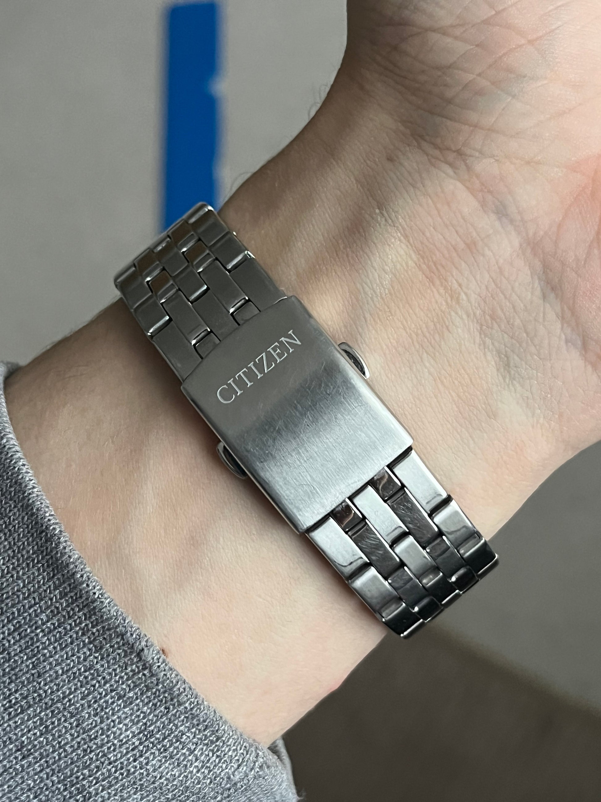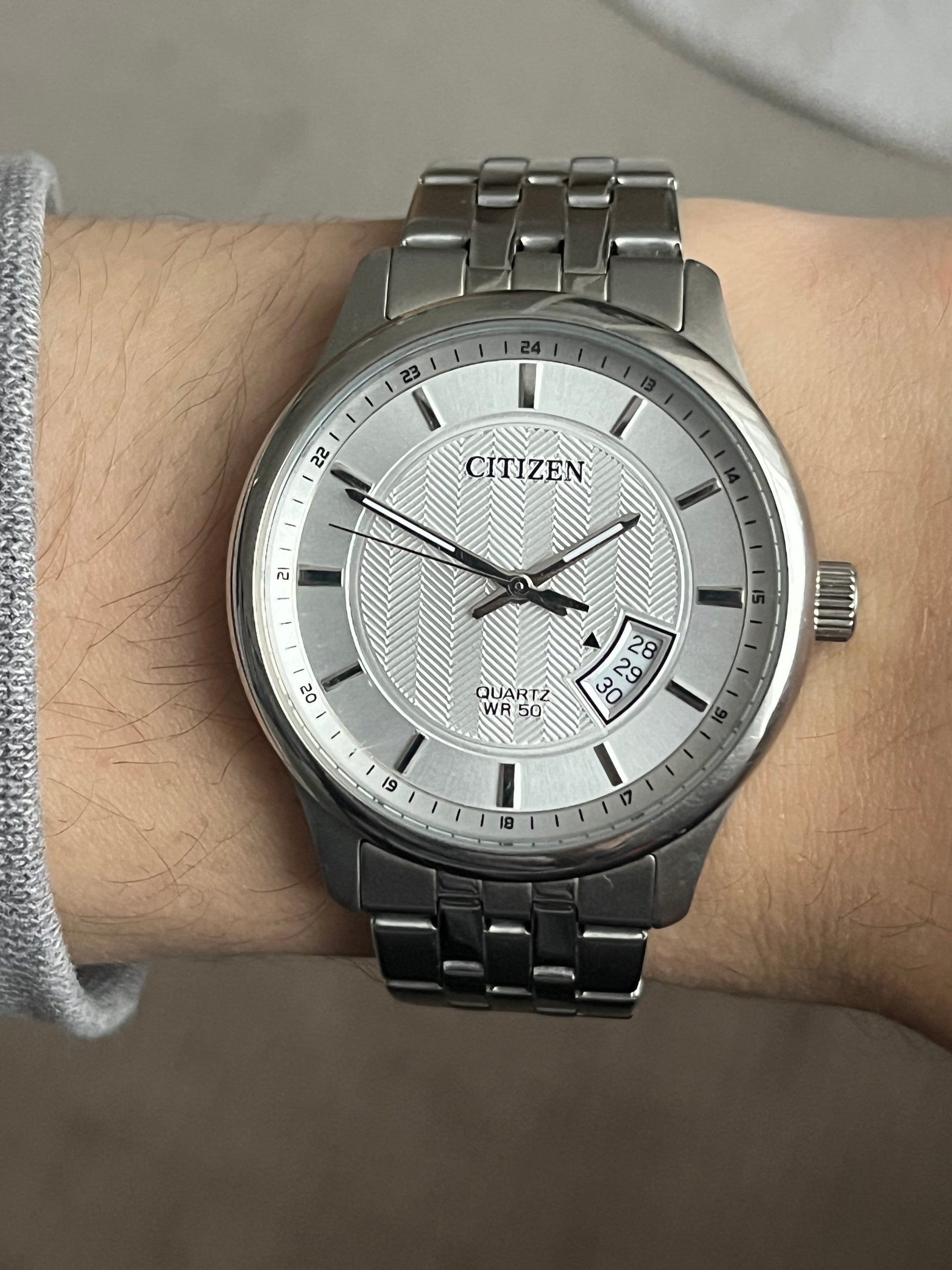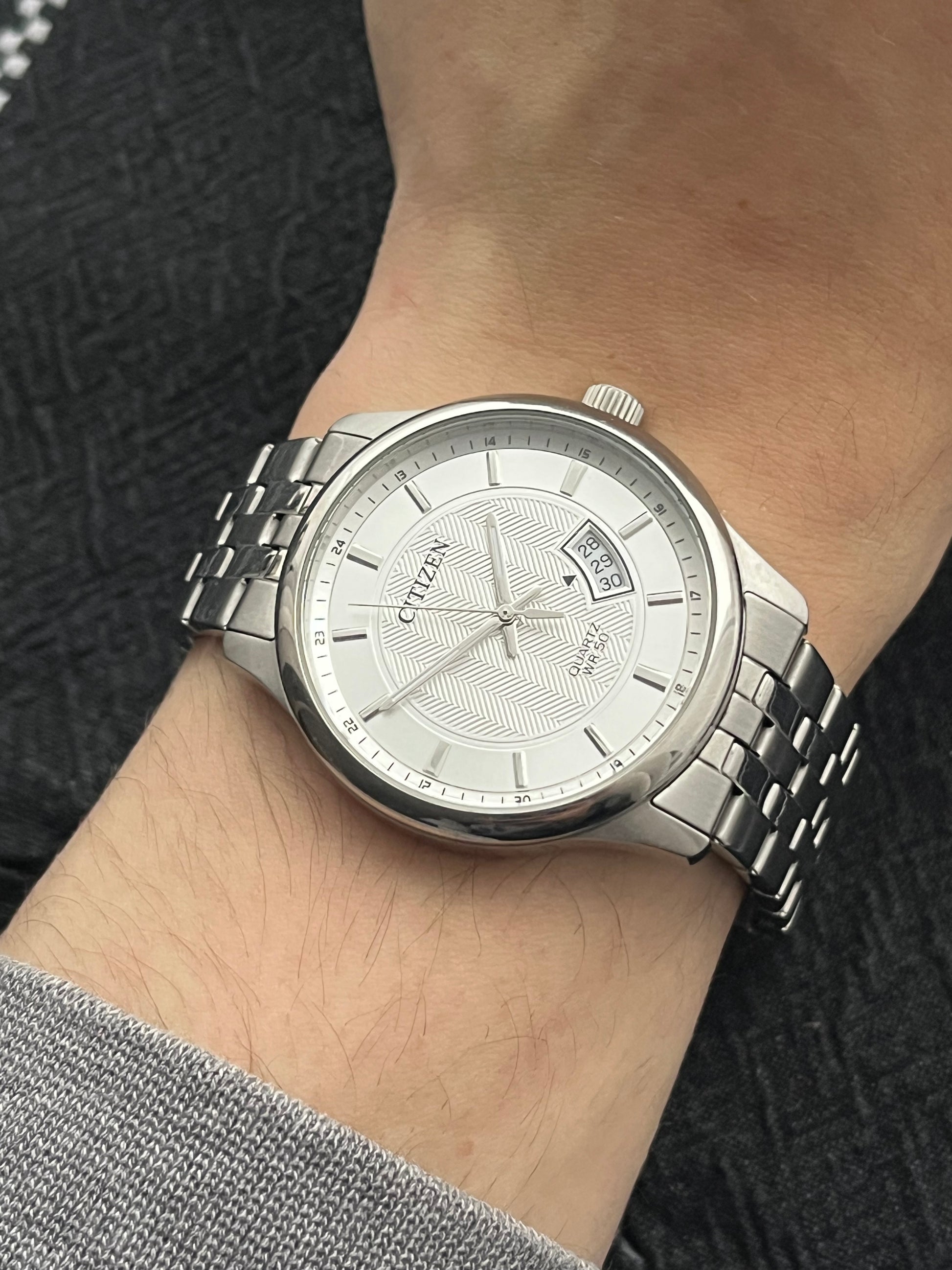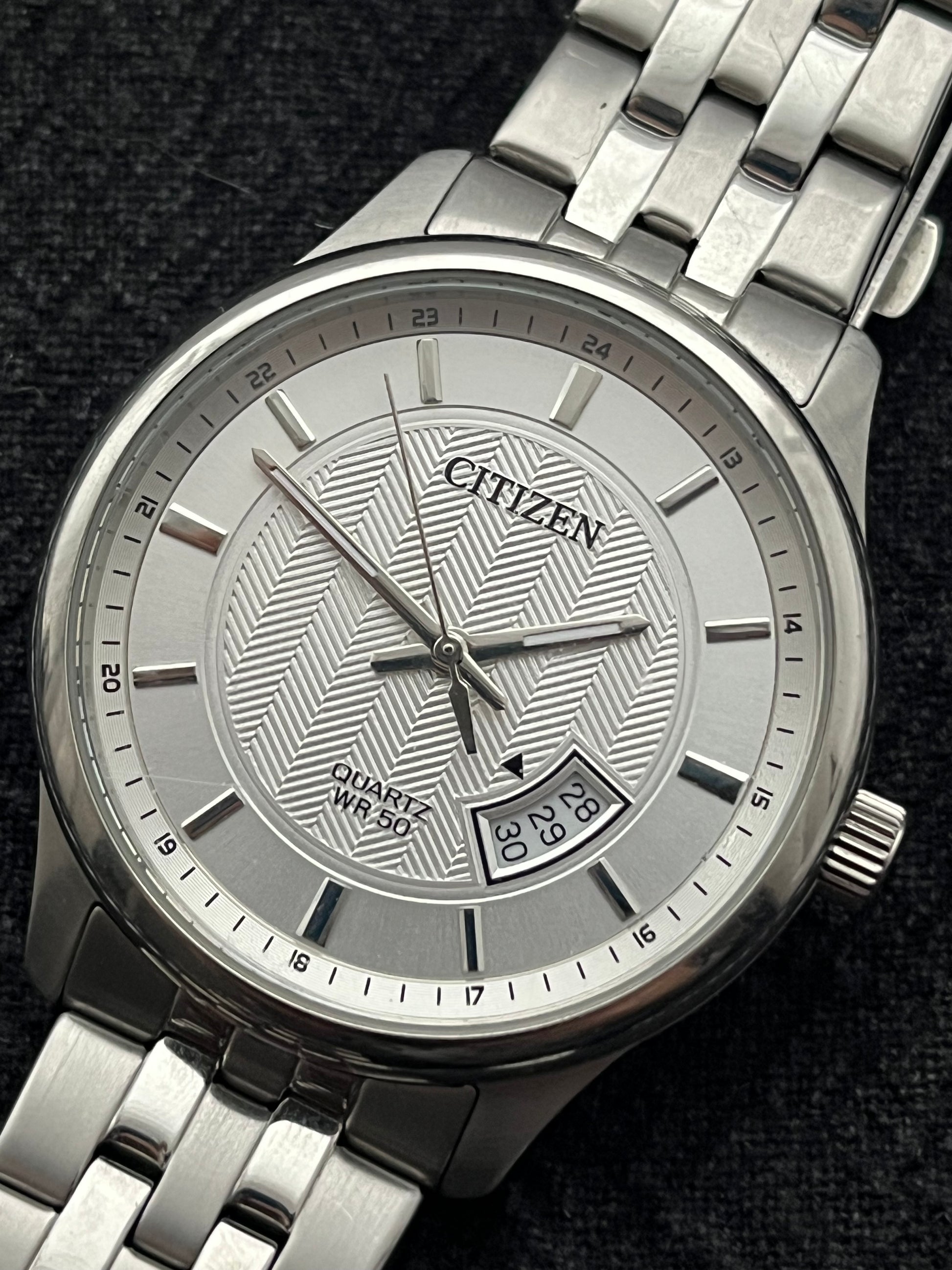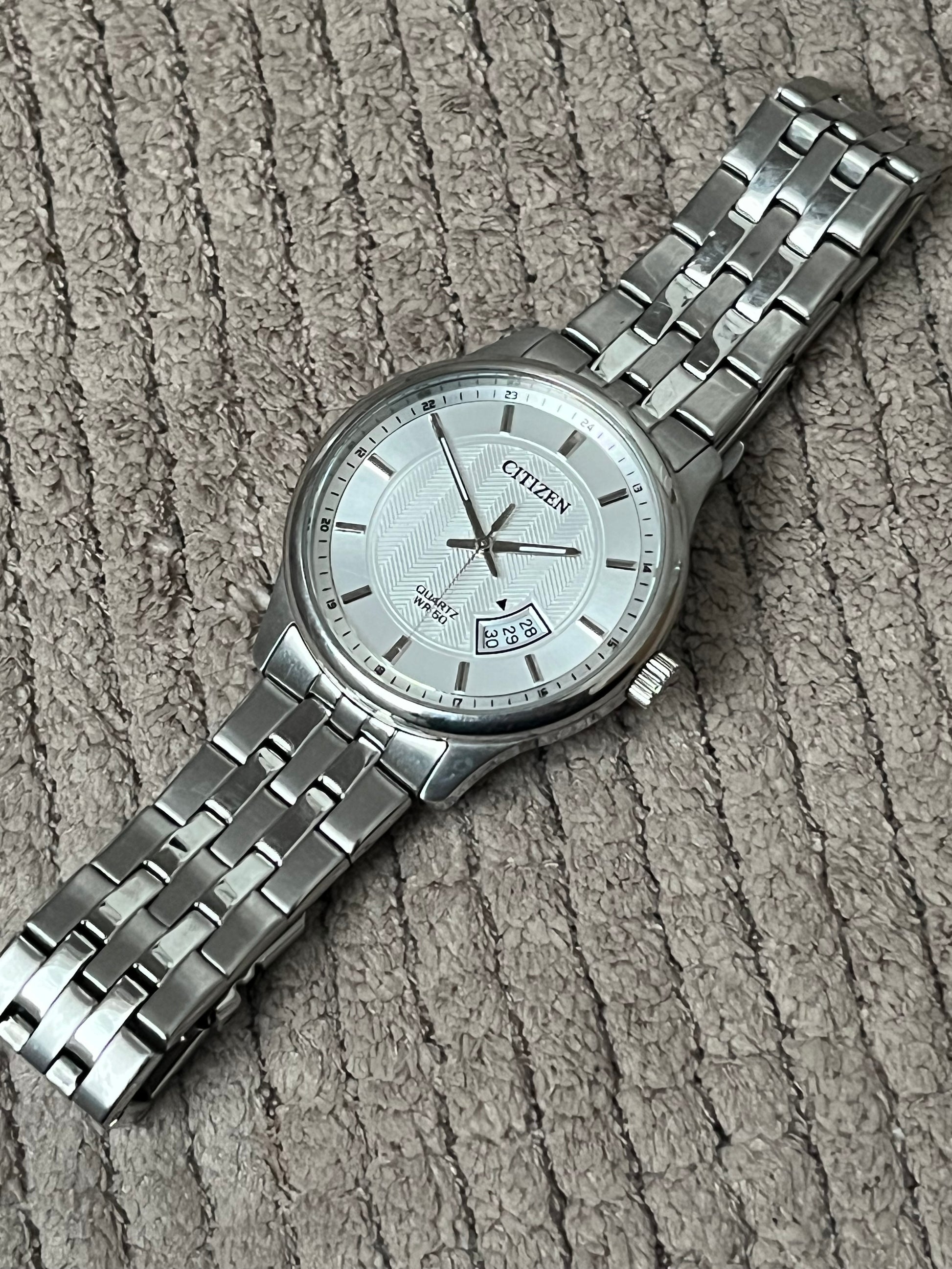 This is a mens citizen date watch with a Clean full silver look . It’s in great condition. full stainless steel case. The hands are illuminous and the watch has 50m water resistance.