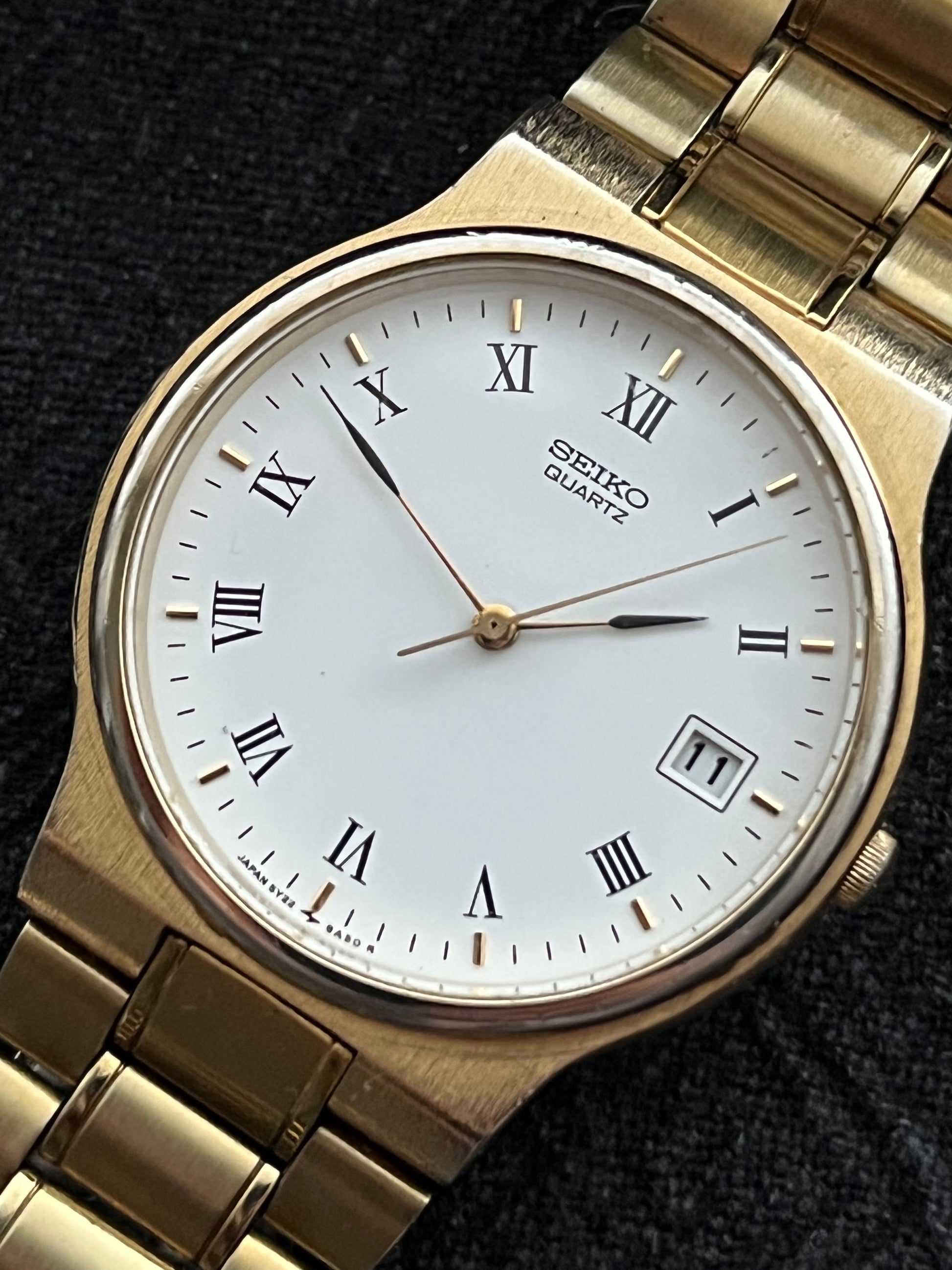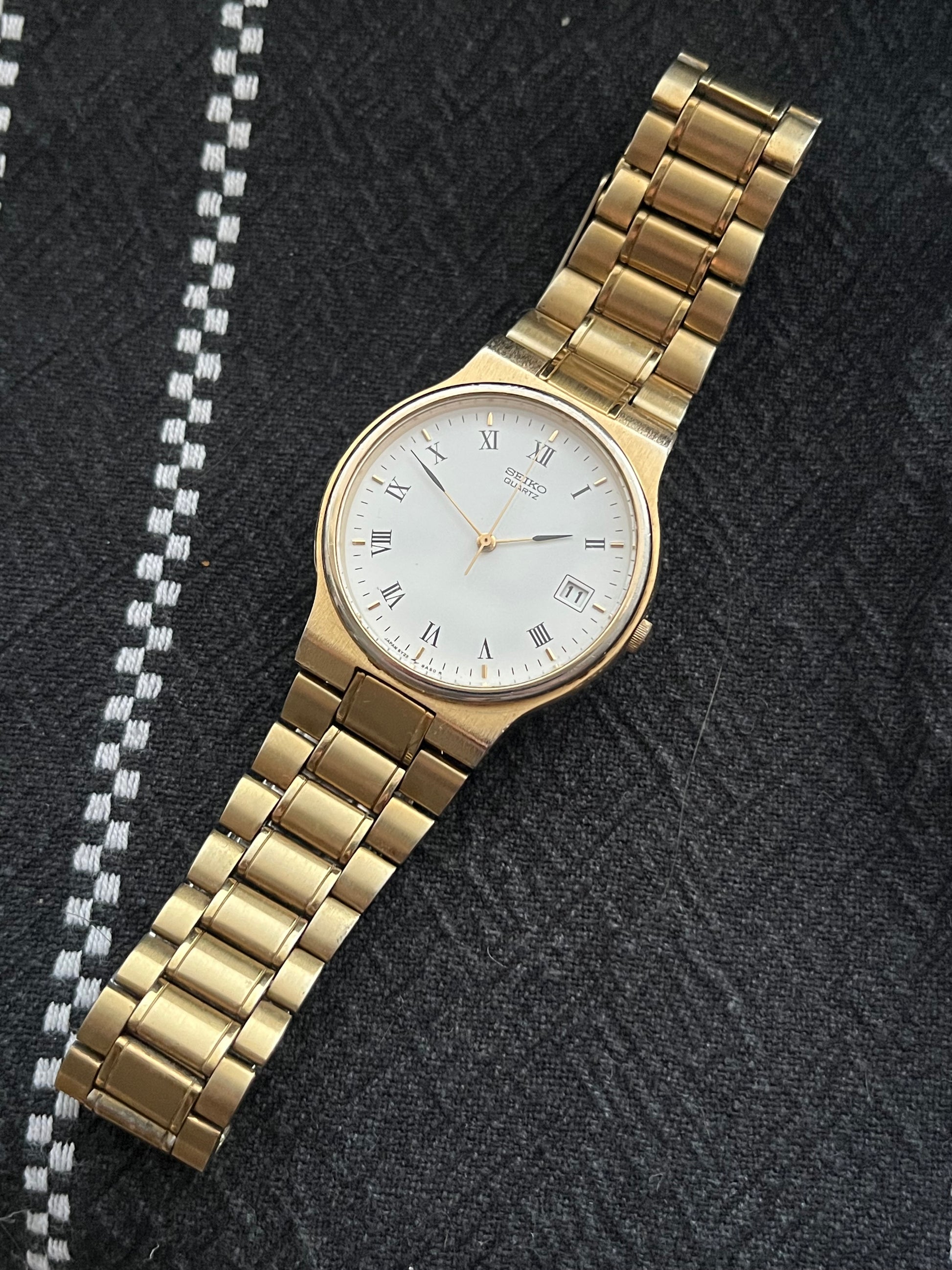This is a vintage seiko quartz date model with the white Roman numeral dial and gold plated case. Produced from 1997-2017. It’s in good vintage condition showing expected age related use.